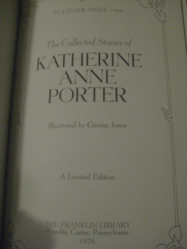 The Collected Stories by Katherine Anne Porter Franklin Library Limited Edition 1st Edition 1st Printing Illustrated Franklin, 1976 VG+. Raised bands, A Limited edition”; full leather with gold lettering and designs ; all edges gilt ; silk moire endpapers ; Illustrated. Pulitzer Prize. A few scuffs, light edge wear and gilt page rubbing. Clean,no writing or marks on interior. A solid collectible copy.