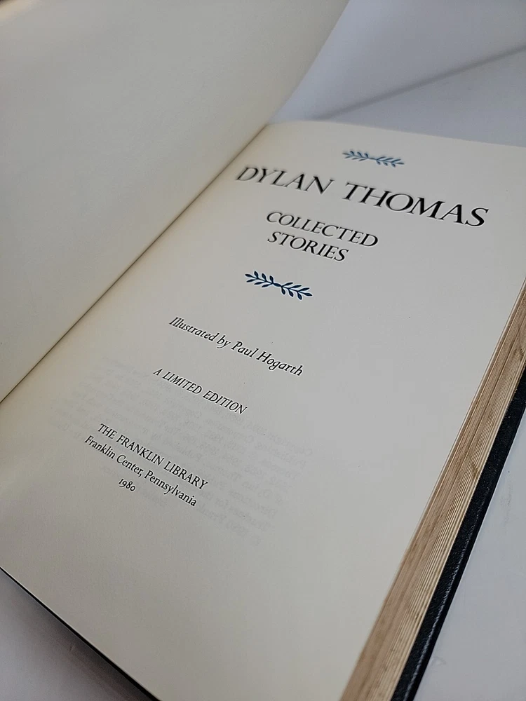 This stunning Franklin Library edition of Dylan Thomas' Collected Stories is a treasure for any book lover! The condition is fantastic—unread and unmarked, with only minor wear and slight foxing. The gilded pages add a touch of elegance, making it a beautiful addition to any collection. A must-have for fans of classic literature!