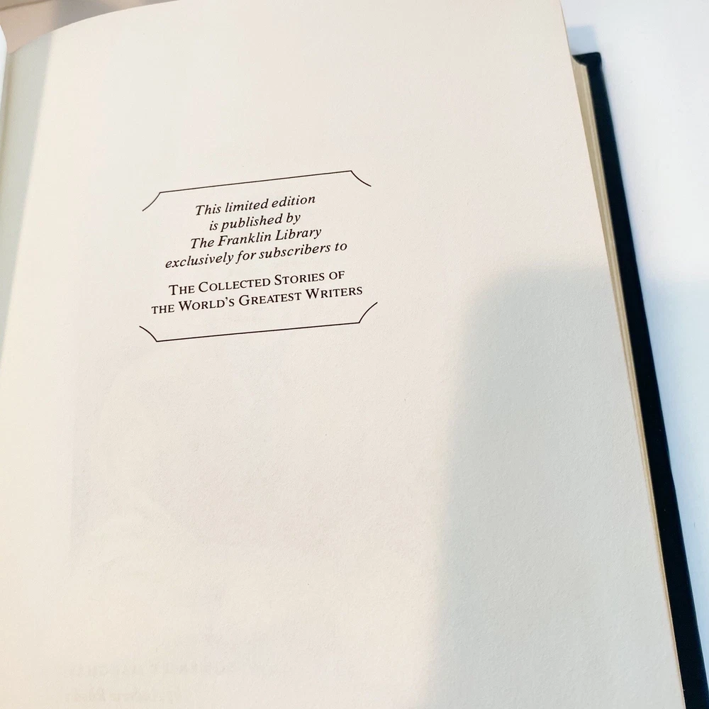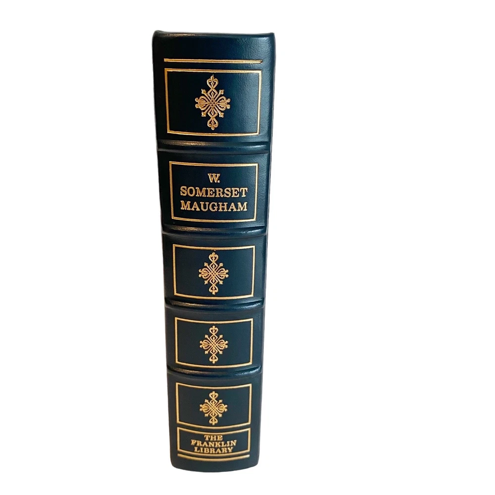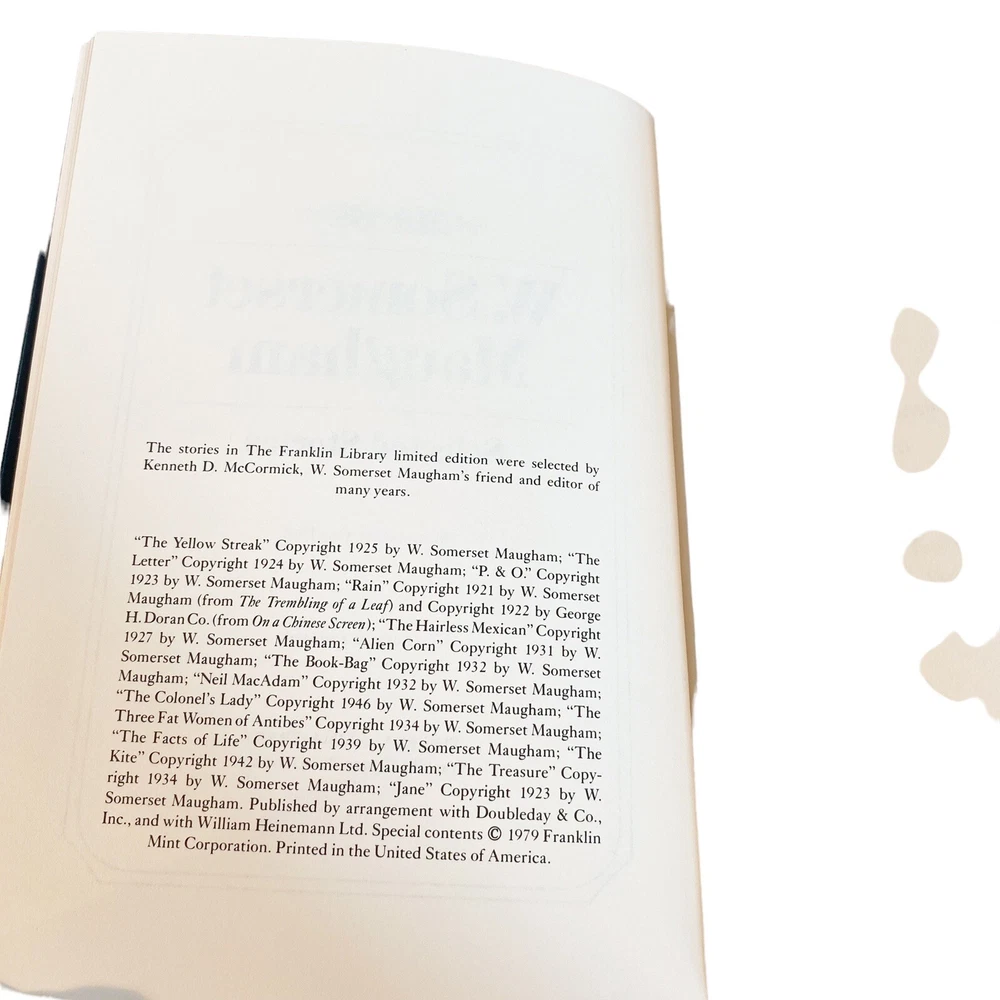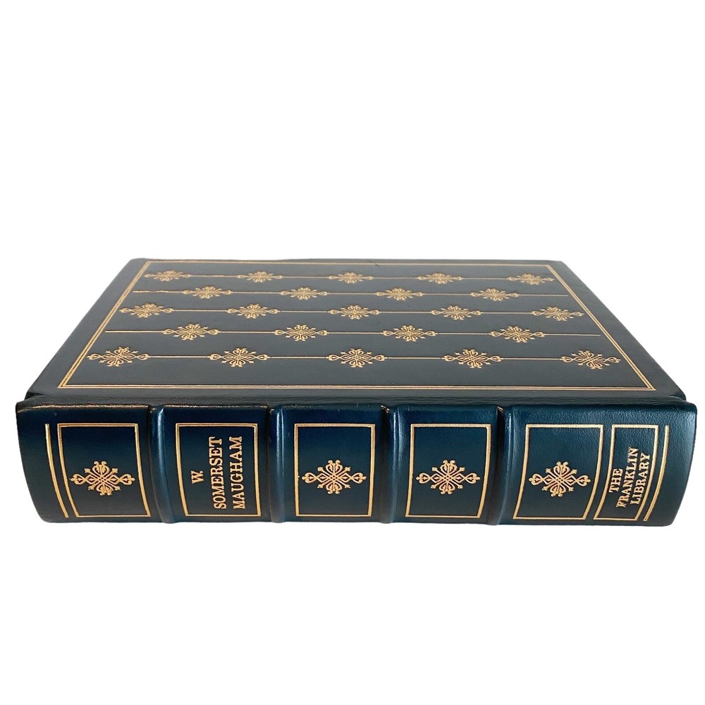 Collected Stories by W. Somerset Maugham 1979 A Limited Leather Book The Franklin LIBRARY this limited edition book is published by the Franklin Library exclusively for subscribers to THE COLLECTED STORIES OF THE WORLD'S GREATEST WRITERS. illustrated by Guy Deel the stories selected in this book are: YELLOW STREAK THE LETTER P.& O. RAIN THE HAIRLESS MEXICAN THE ALIEN CORN THE BOOK-BAG NEIL MACADAM THE COLONEL'S LADY THE THREE FAT WOMEN OF ANTIBES THE FACTS OF LIFE THE KITE THE TREASURE JANE THIS BOOK IS IN BEAUTIFUL CONDITION FOR IT'S AGE front and back page is a little pink from age 536 pages 8 3/4 inches x 6 inches x 2 inches the book is a dark green/blue tone with gold detail.