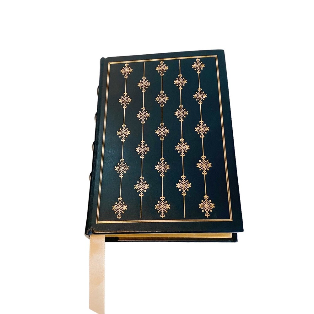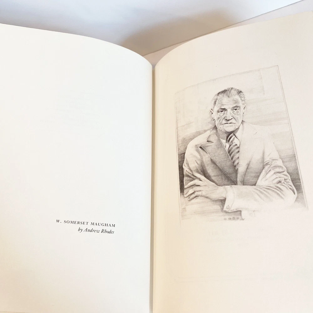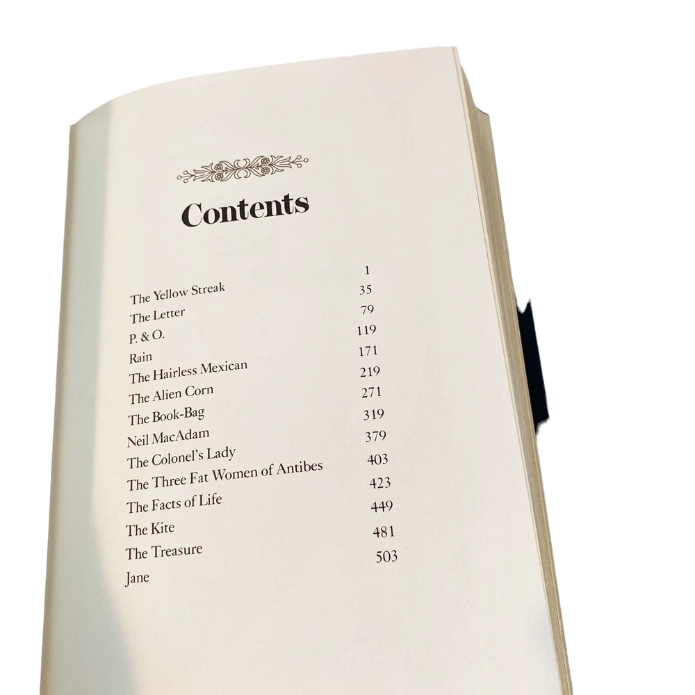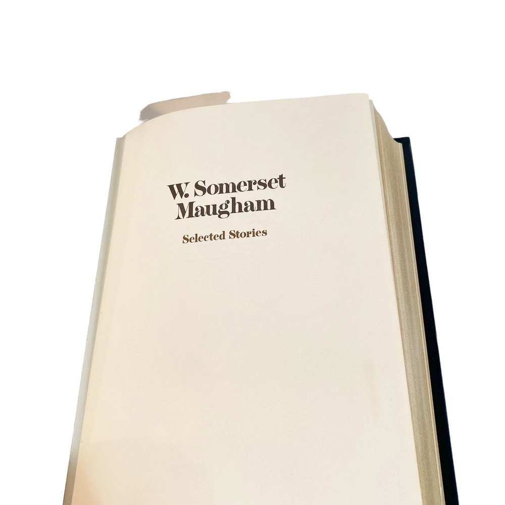 Collected Stories by W. Somerset Maugham 1979 A Limited Leather Book The Franklin LIBRARY this limited edition book is published by the Franklin Library exclusively for subscribers to THE COLLECTED STORIES OF THE WORLD'S GREATEST WRITERS. illustrated by Guy Deel the stories selected in this book are: YELLOW STREAK THE LETTER P.& O. RAIN THE HAIRLESS MEXICAN THE ALIEN CORN THE BOOK-BAG NEIL MACADAM THE COLONEL'S LADY THE THREE FAT WOMEN OF ANTIBES THE FACTS OF LIFE THE KITE THE TREASURE JANE THIS BOOK IS IN BEAUTIFUL CONDITION FOR IT'S AGE front and back page is a little pink from age 536 pages 8 3/4 inches x 6 inches x 2 inches the book is a dark green/blue tone with gold detail.