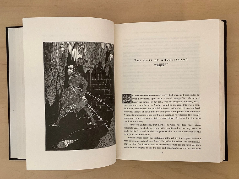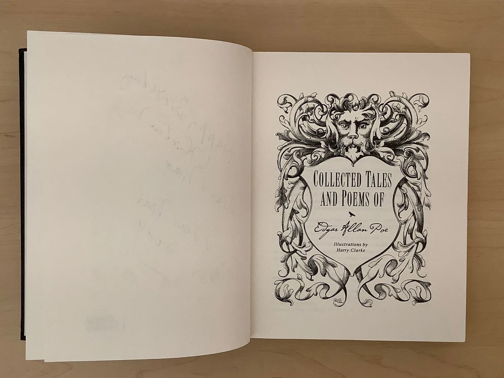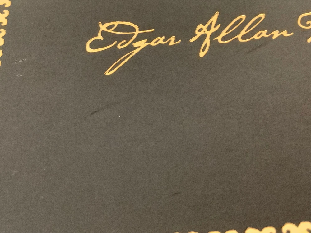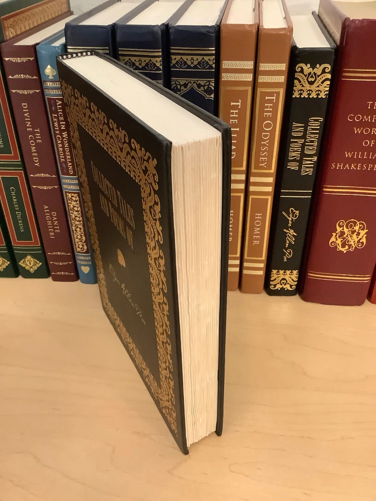 Collected Tales And Poems Of Edgar Allan Poe bound in black leather illustrations by Harry Clarke Item Condition: This is a leatherbound hardcover in Good condition. There is a gift inscription at the front of the book (see photo #8). The binding is tight and the pages are clean with some light marks / dings to the edges, and also some small nicks/ tears (see photos #3 - 6 and #14). The leather is in nice condition with some minor signs of wear with indents and marks to the front and back cover (see photo #15) and mild bumping to the corners and spine. Dimensions are approx: 8.5" x 6.75" x 1" This book will ship in a box with bubble wrap. Photos are of the actual book that will be shipped.