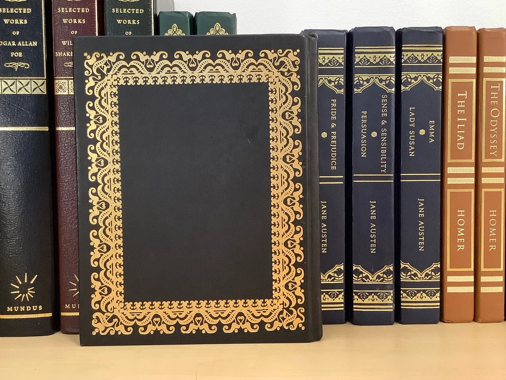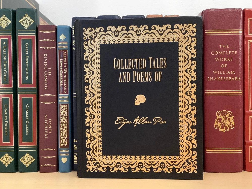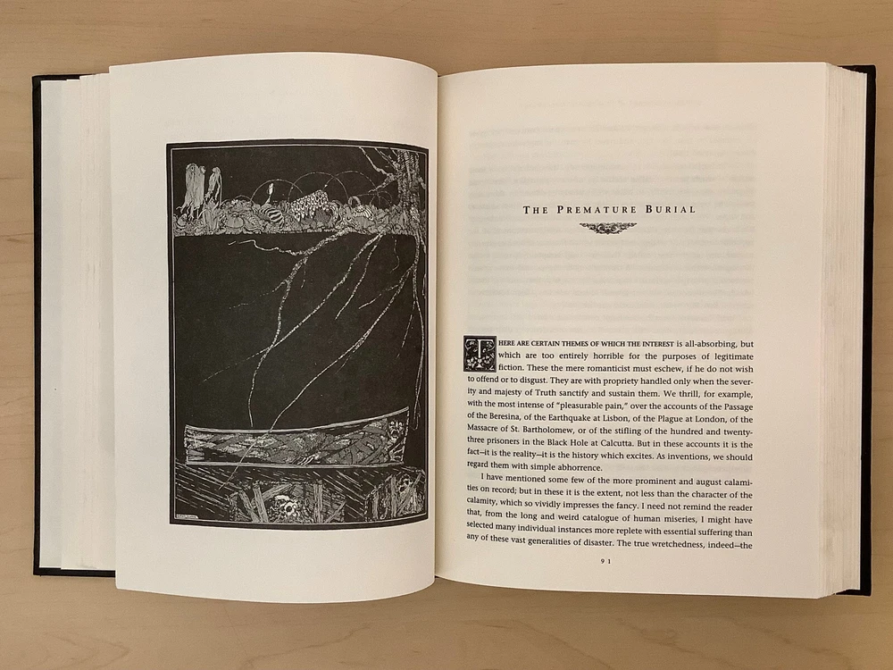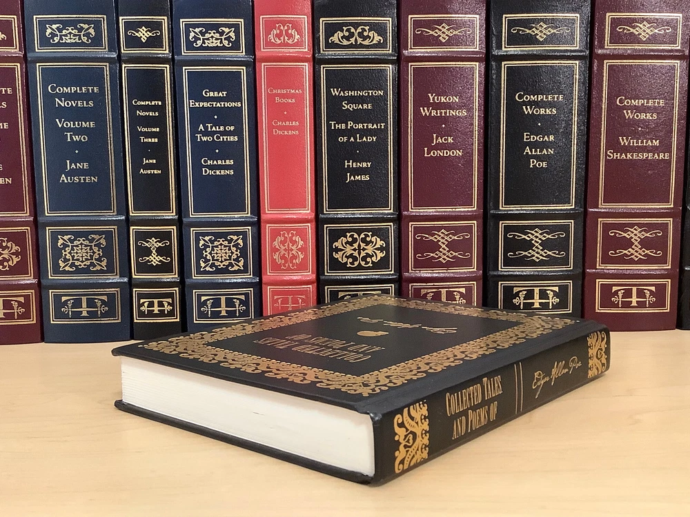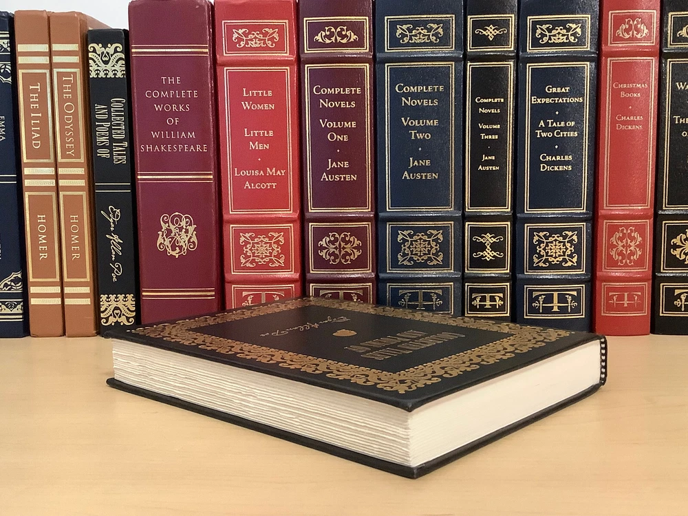 Collected Tales And Poems Of Edgar Allan Poe bound in black leather illustrations by Harry Clarke Item Condition: This is a leatherbound hardcover in Good condition. There is a gift inscription at the front of the book (see photo #8). The binding is tight and the pages are clean with some light marks / dings to the edges, and also some small nicks/ tears (see photos #3 - 6 and #14). The leather is in nice condition with some minor signs of wear with indents and marks to the front and back cover (see photo #15) and mild bumping to the corners and spine. Dimensions are approx: 8.5" x 6.75" x 1" This book will ship in a box with bubble wrap. Photos are of the actual book that will be shipped.