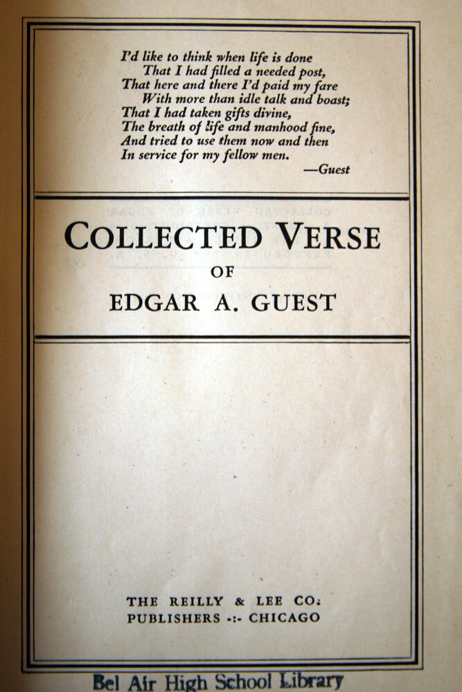 Description Collected Verse of Edgar A. Guest. Rare Leather Bound Copy published in 1953 by Reilly & Lee Co. Ex-library copy. 937 pages. Books will be packed securely for safe shipment. Books will ship via USPS Media Mail, unless otherwise requested. If you would like to upgrade to an expedited shipping method, please contact me for a quote. Please view the photos and contact me with any specific questions. F6 **Please contact me with any questions prior to bidding. Check out my other listings now!** ***Please note: If you are bidding on a used or antique book... We do our best to accurately describe each book and identify any flaws it may have. If you have specific questions regarding its condition, please never hesitate to ask. Unfortunately, we cannot always inspect each page, and therefore grading is from visual inspection and browsing through the book. Unless stated otherwise, our books will contain signs of wear and age which is normal within the vintage/antiquarian category. We offer primarily used, vintage and antique books. Our books are stored in a dry, 100% smoke-free environment . We will always mention if a book has a noticeably unpleasant odor, however if you have a particularly sensitive sense of smell, we cannot recommend that you purchase any antique or vintage books. Payment Paypal Accepted. Shipping FREE USPS Media Mail shipping anywhere in the U.S. **International Buyers please contact me for a shipping quote prior to purchase.** Return Policy We consider All Sales to be Final. Returns Accepted for Full Refund of Purchase Price only if item arrives significantly not as described. Shipping & Handling costs will not be refunded under any circumstances. Please be sure that this is the item you are looking for prior to bidding. If you have any questions about the content of an item, condition of an item or a question about any of our policies please do not hesitate to ask. Feedback If you were pleased with your purchase and experience with us please leave a feedback comment.