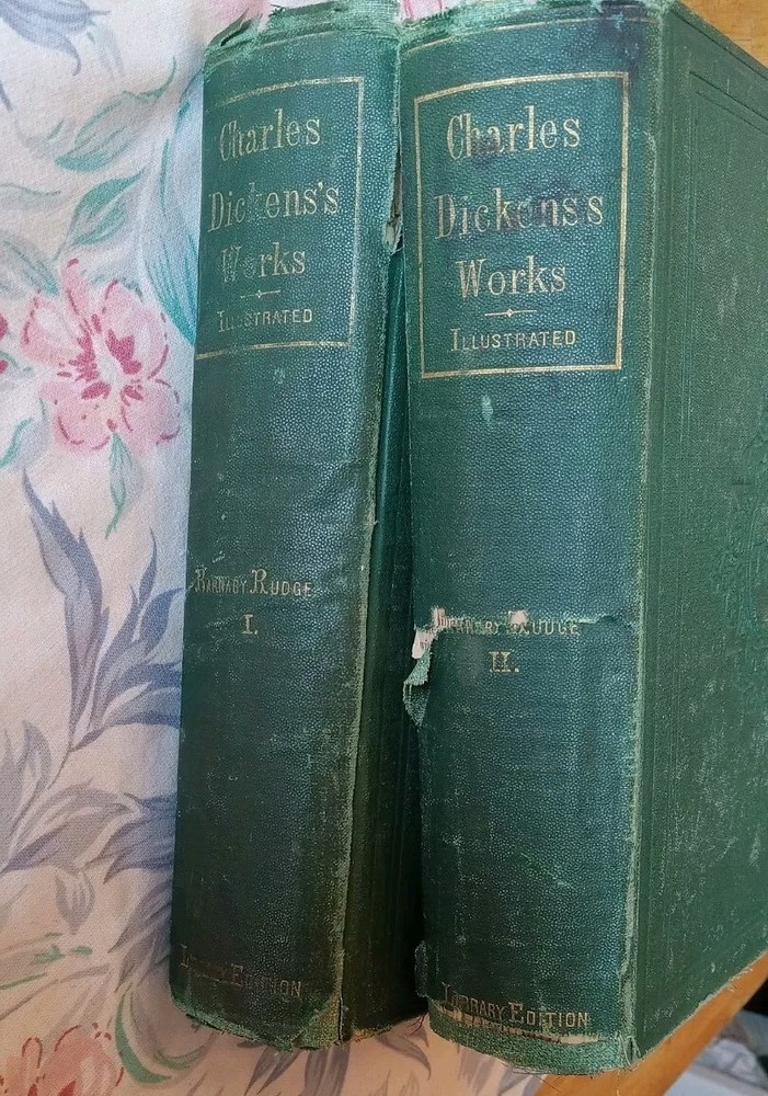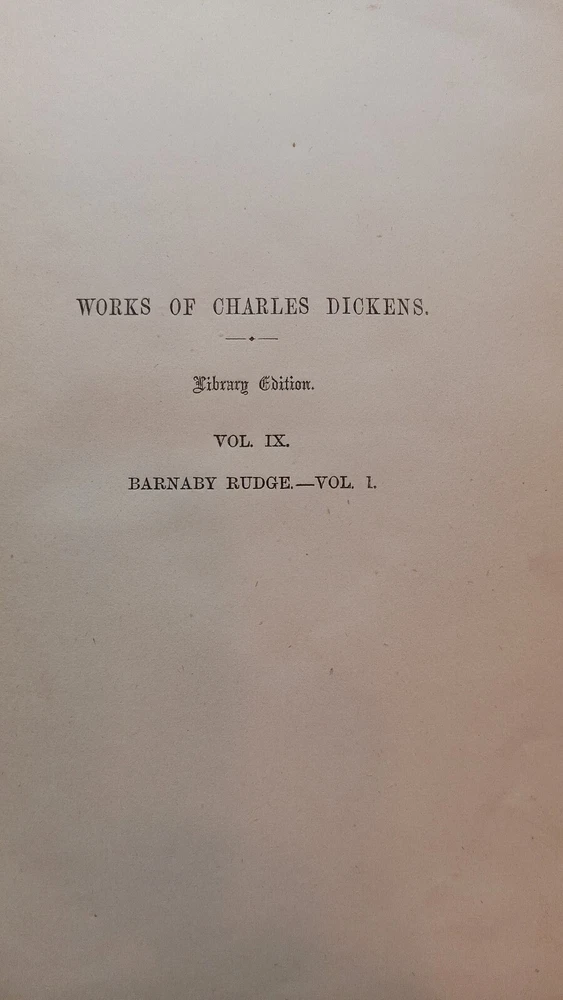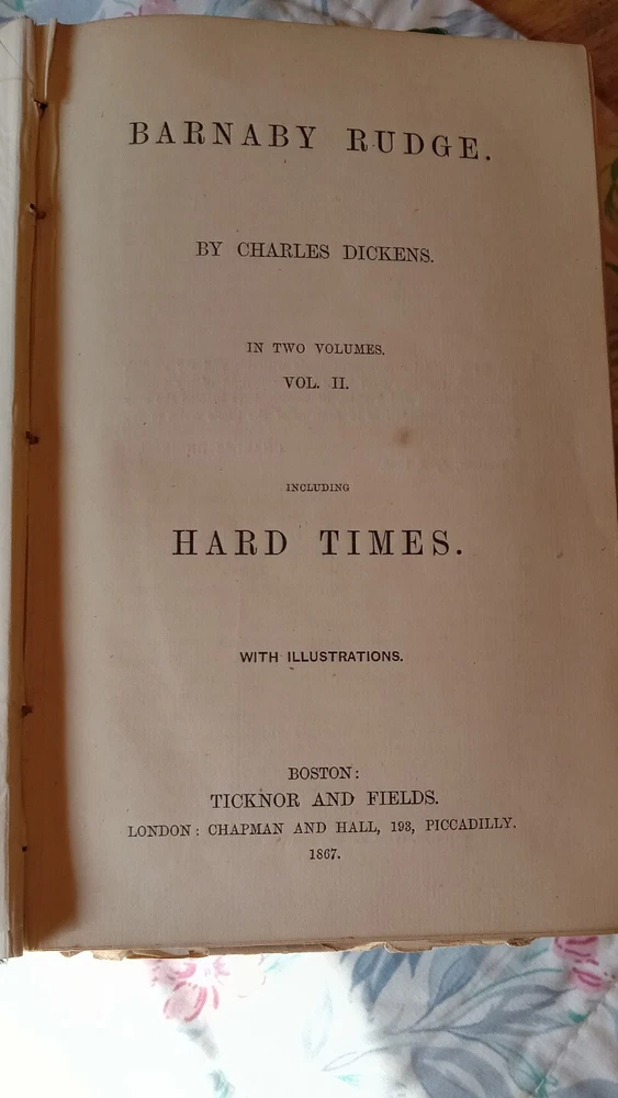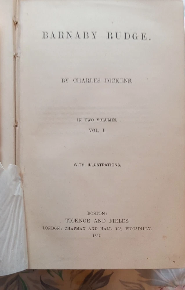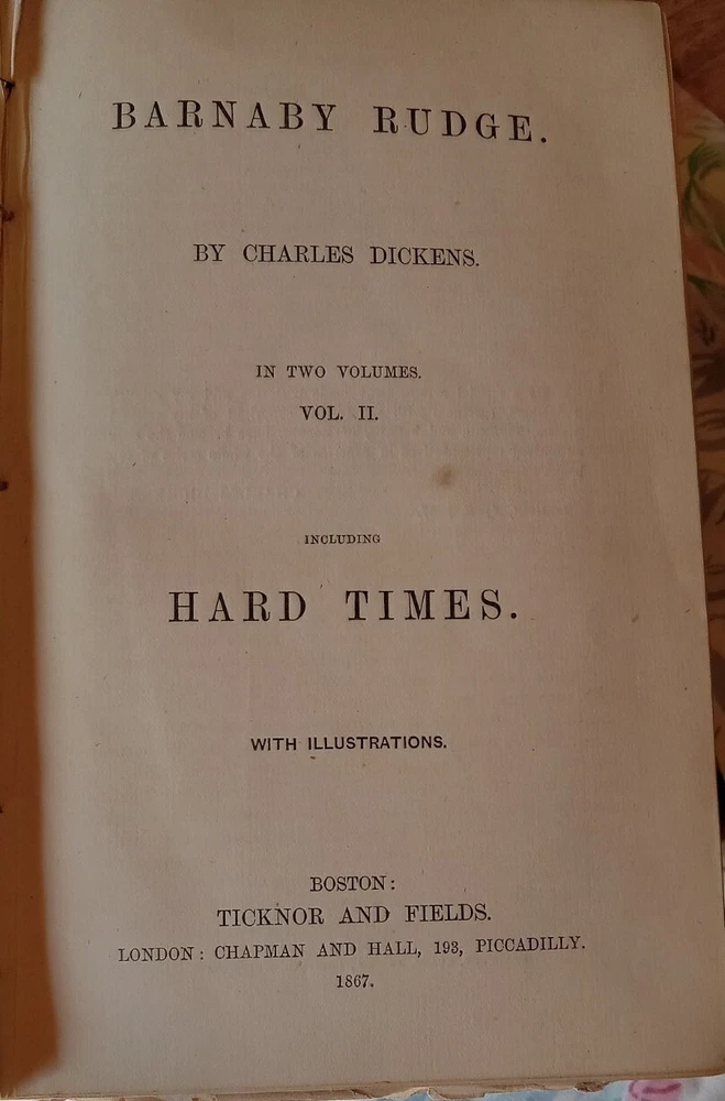 Ticknor and Fields of Boston were the first American publishers/ distributors given permission by Dickens and his English book partners to distribute his works in America. This is one of the first collections of Dickens works ever published -1867! This lot includes Barnaby Rudge in 2 volumes...this 2 volume set makes up volume 9 of a larger set, the rest of which is unavailable. This very early copy of Barnaby Rudge will come as shown.