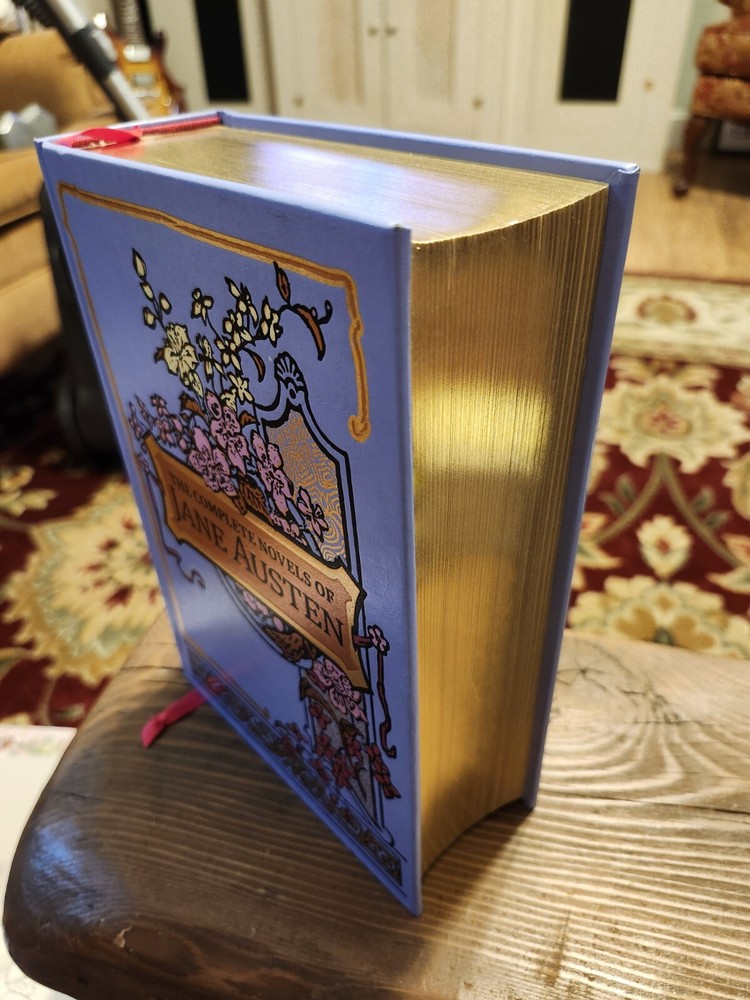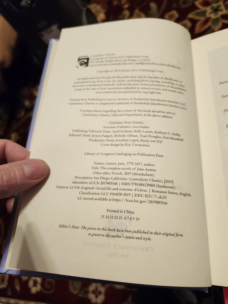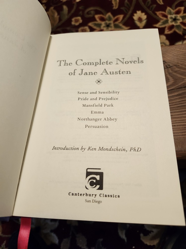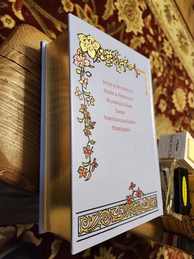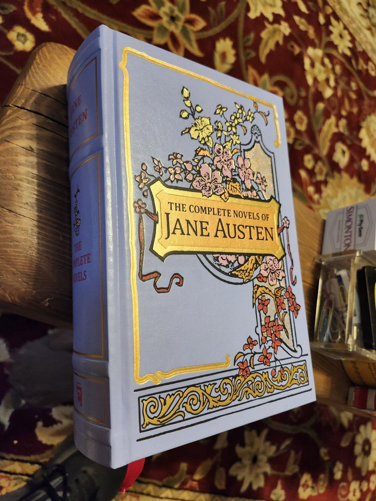 HB book, "Complete Novels of Jane Austen", by Printers Row (Canterbury Classics), 2019, 1210 pages, 1 illustration. Book is basically mint, gilt page ends, gilt/embossed design, sewn in bookmark, think it may be leather (not sure -- ISBN prefab info says it is -- again, I'm not sure). Clean inside and out A neat book! Heavy book, but free shipping!