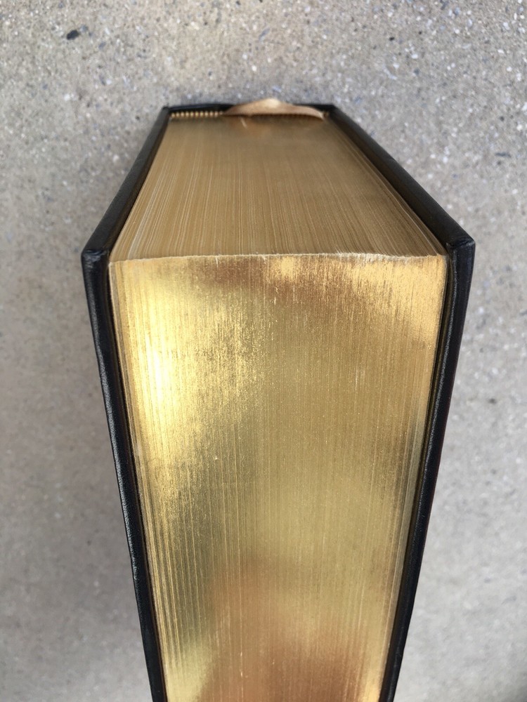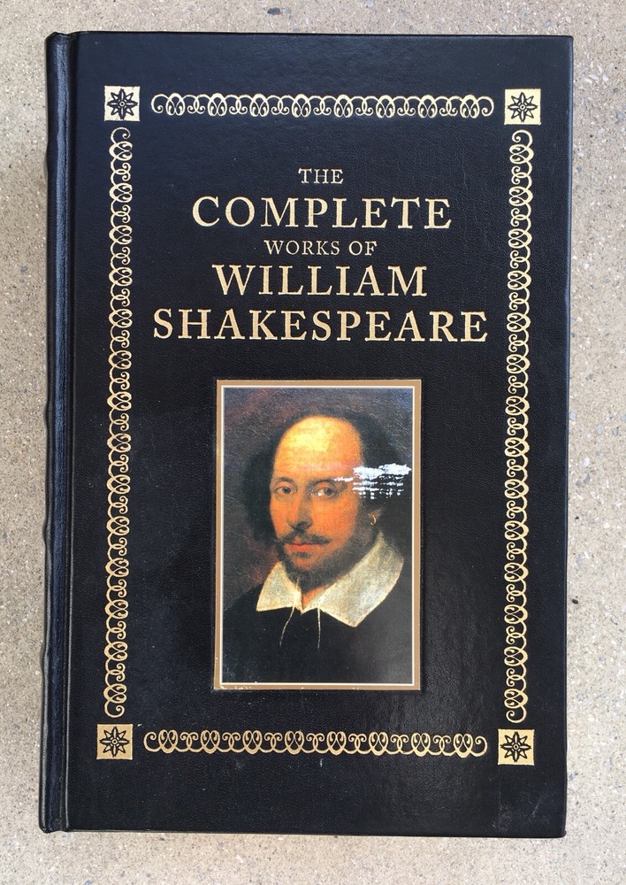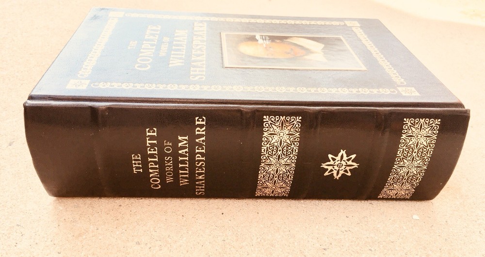 THE COMPLETE WORKS OF WILLIAM SHAKESPEARE Black leather covers are decorated with gilt and portrait of Shakespeare on the front. (The white on the portrait does not come off. I don't know what it is, possibly a manufacturer defect?) Gilt title and decoration with raised bands on spine. Slight bumping to bottom corners, front and back. Back cover is rubbed in places, slight indentation in middle (please see pics). Text block is gilt all around and is bright. Contents are tight in the binding and are clean, no tears, no markings, no bad odors. Attached gold colored ribbon bookmark. 1263 ppgs. includes glossary ... a very thick book. ***Please view photos as they are an important part of the description and message any questions prior to bidding. Thanks for looking!! * All sales are final so please know what you are buying. We do our best to provide accurate descriptions and photographs and strive for excellence in our customer care but being as we are human, we can miss the mark sometimes, so if there is a problem please notify us asap so we can help to resolve any issues. **Please note that when you agree to purchase an item, you are agreeing to the stated shipping cost. Shipping costs have risen dramatically!!! We do our best to be accurate and sometimes we have to guestimate. Please take into consideration the cost of packaging as well as the gas it requires to get to the post office so if the shipping cost is a bit more than the actual cost to ship we appreciate your kind understanding and extended grace ...