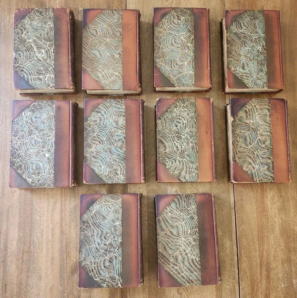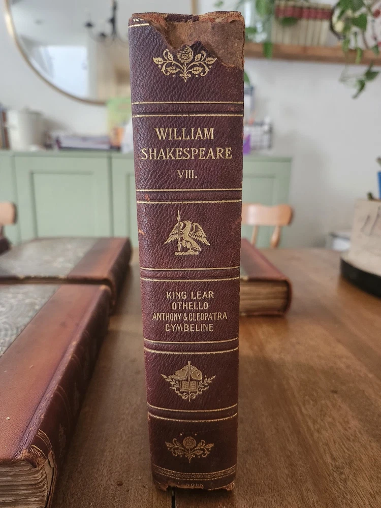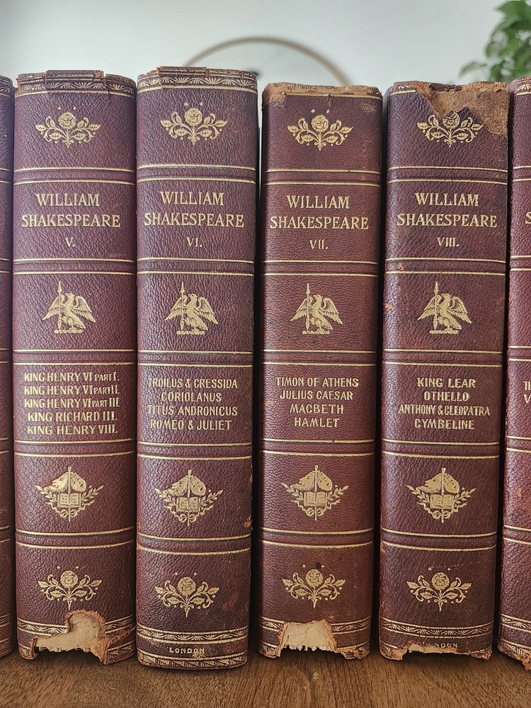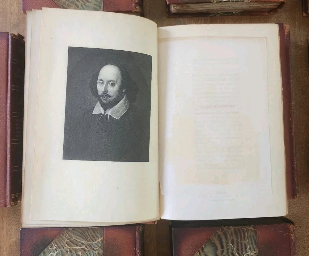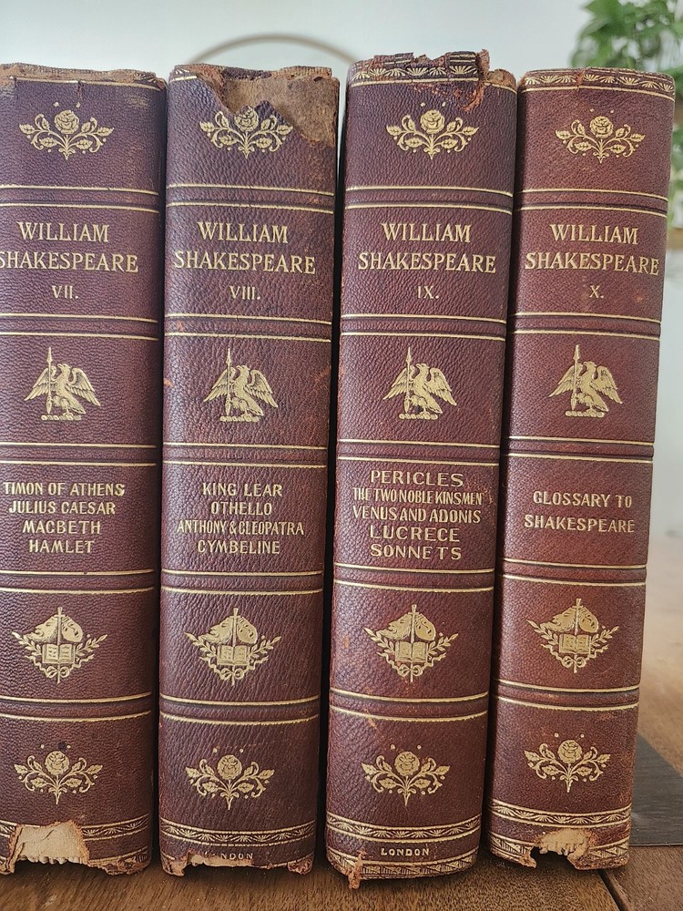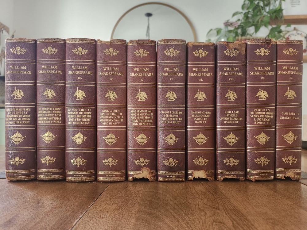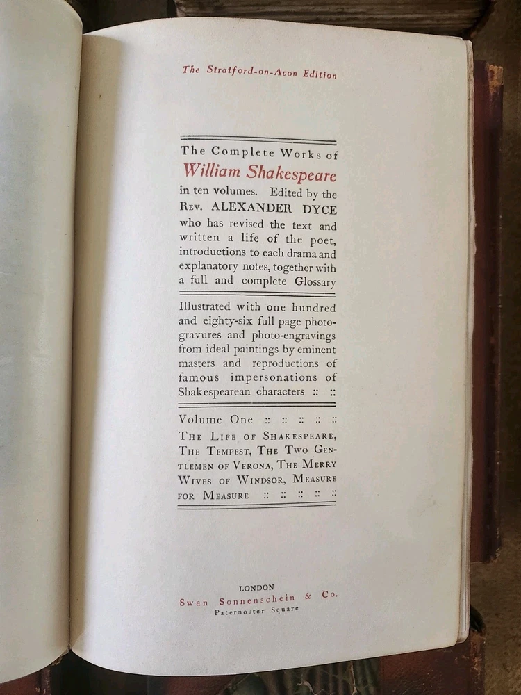 Complete Works of William Shakespeare 10 Vol LEATHER Stratford on Avon Ed 1880. This collectible set of Shakespeare's works is a must-have for any literature enthusiast. The beautiful leather binding and marbled end papers make for a stunning addition to any book collection. The set includes 10 volumes, each containing a variety of his plays and poetry, all written in the original English language. The set is intended for young adults and ages 9-12, but can also be enjoyed by adults. It was published in 1880 by Swan Sonnenschein and is a vintage Stratford-on-Avon edition. The set features quartered leather with marble boards, onion skin pages over illustrations, and hand-torn pages. This set is perfect for anyone interested in classic literature and the English Renaissance literary movement. Condition: I strive to take excellent photos so you can accurately see the condition of the books. Shipping: I ship in boxes and not padded envelopes to ensure your new books get to you safely. Offers encouraged!