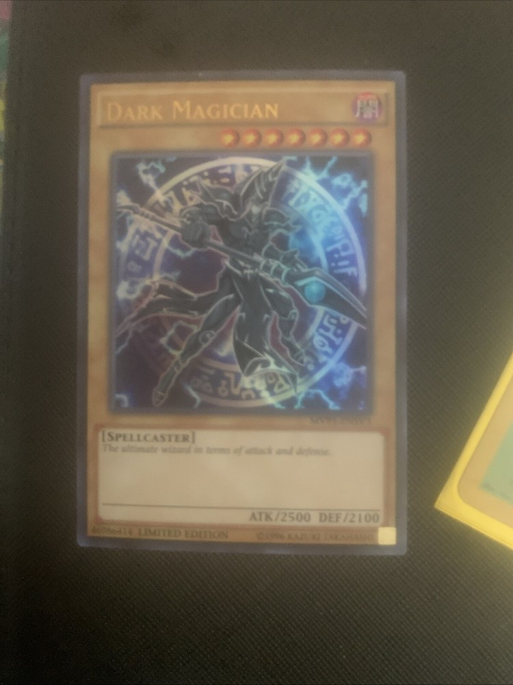 Dive into the mystical world of Yu-Gi-Oh! with the Dark Magician MVP1-ENGV3 card, a treasured addition to any collection. This Secret Rare, Limited Edition holographic card from the Yu-Gi-Oh! The Dark Side of Dimensions Movie Pack Gold Edition set captures the enigmatic allure of the Dark Magician character, Yugi Muto, rendered in stunning holographic detail. Crafted by Konami and designed for players and collectors over 7 years old, this English-language card boasts a Standard card size and an ethereal Darkness attribute. Whether you're looking to enhance your game or cherish a piece of Yu-Gi-Oh! history, this card is a must-have for both seasoned duellists and avid collectors alike. Very Lightly Played to Near Mint comes with fast shipping in a hard case toploader. Tracking costs.