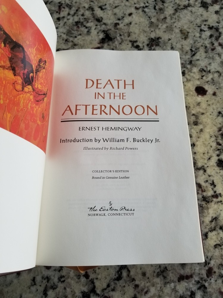 Death in the Afternoon by Ernest Hemingway Published by Easton Press, Norwalk, CT, 1990. One of The Collected Works of Ernest Hemingway series published by Easton Press in 1990. Genuine leather binding. Excellent condition. Flawless.