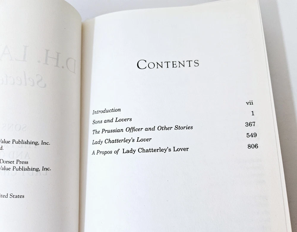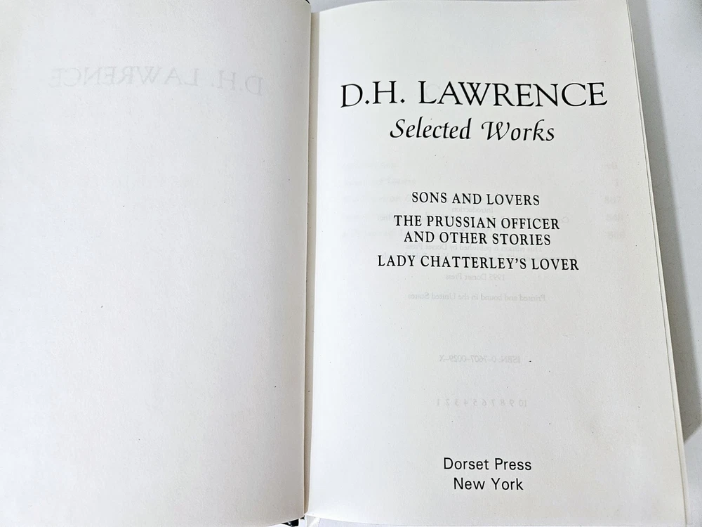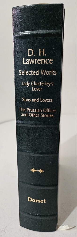 This vintage hardcover book titled, D.H. Lawrence Selected Works is a must-have for any literature enthusiast. With 832 pages of unabridged content, this book offers a comprehensive collection of the author's novels and poetry. The leather-bound format adds a touch of elegance to this antique piece, making it a great addition to any book collection. The book was published by Dorset Press in 1995 and is written in English. It is intended for young adults and adults, with a focus on modernism and world literature. This book is not personalized or signed, and it does not come with an ex libris or inscription. Overall, this is a fantastic opportunity to own a piece of literary history. Clean type binding guilt edges, Ribbon marker.