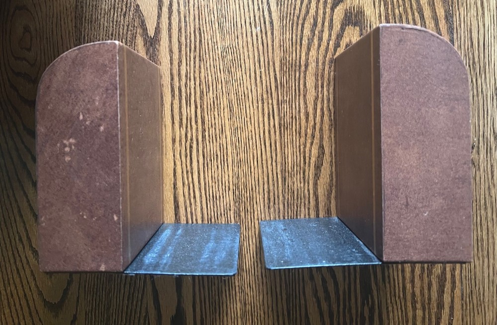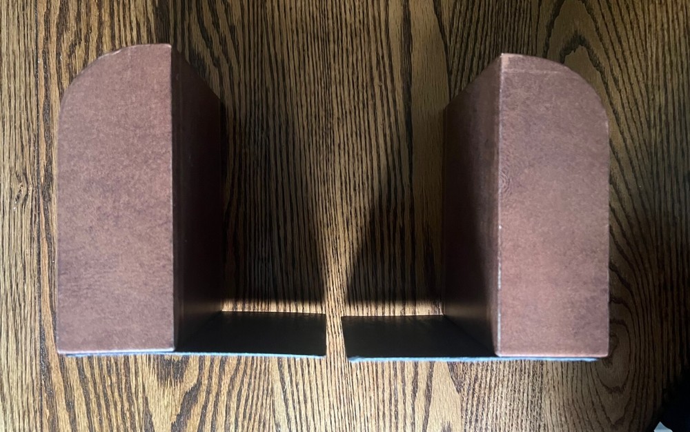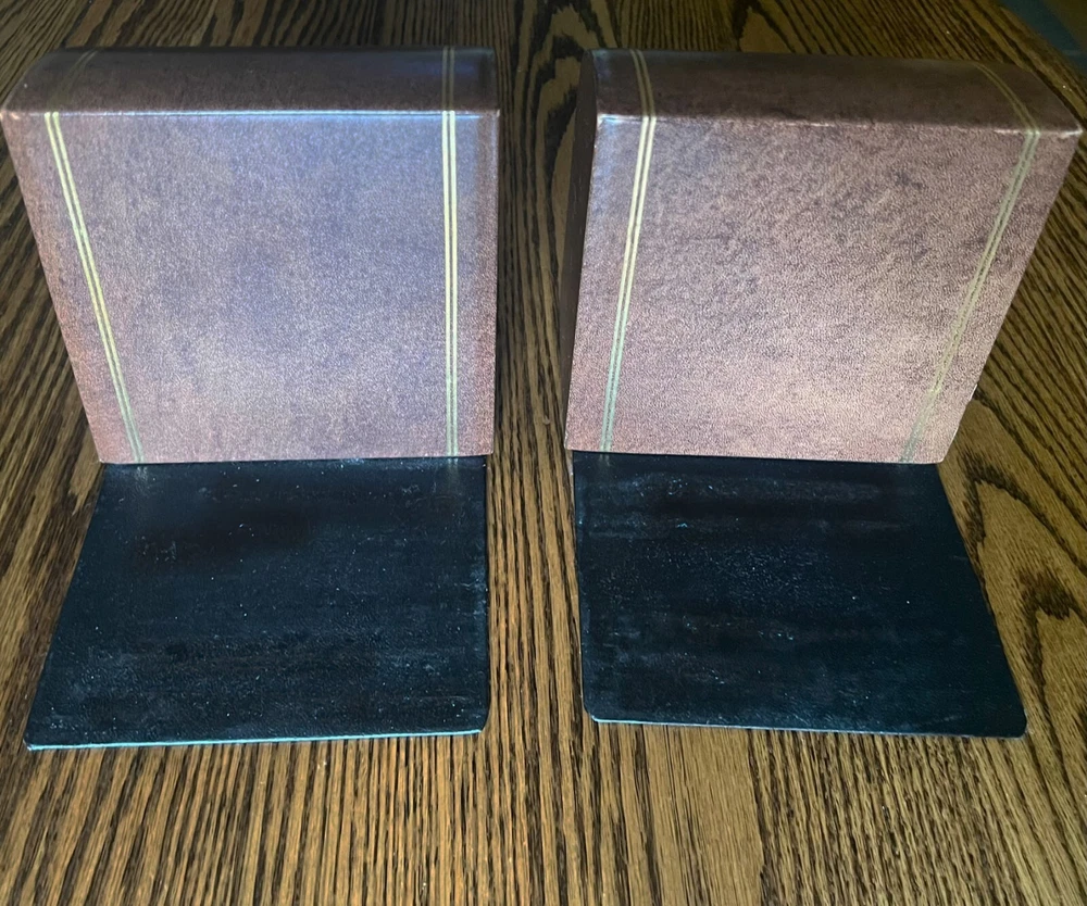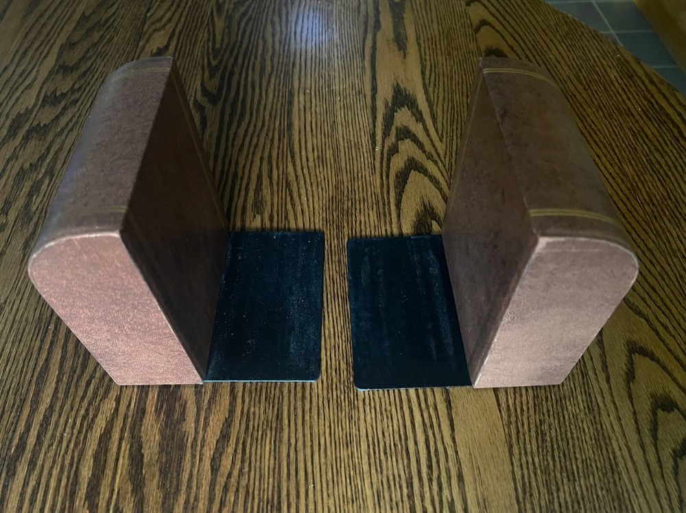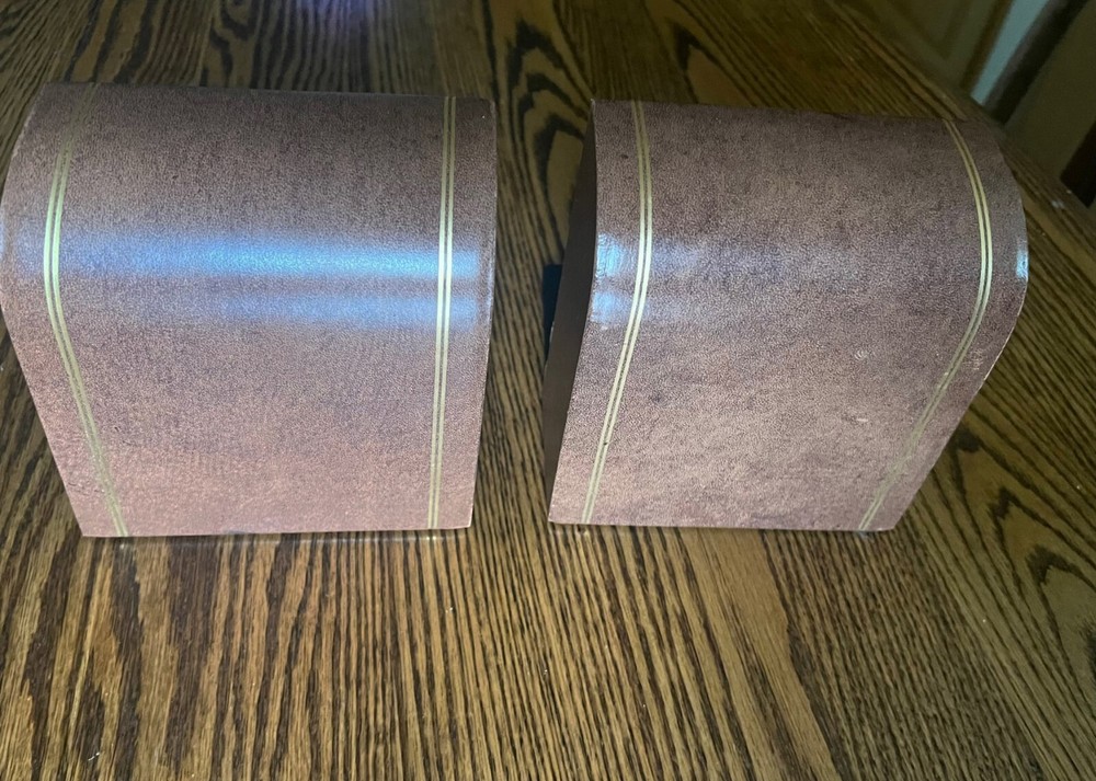 Add an elegant touch to your bookshelf with these vintage Dapco leather bound bookends. The rectangular shape and medium size make them a perfect fit for any book collection. The brown leather and gold gilt trim add a classic Art Deco touch that will complement any room's decor. These bookends are perfect for adults who enjoy collecting decorative items. The heavy weight ensures they will securely hold up your books without any issues. The brand, Brown, and original time period manufactured, 1950-1959, give these bookends a unique charm. They are ideal for collectors of decorative items and lovers of vintage decor. 2+ pounds each end (made to hold) 6.1" tall, 5.4" wide and 5.25" deep Very long time EBay seller, perfect score, buy with confidence.
