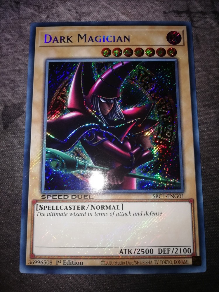 Dark Magician 1. Edition Secret Rare SBC1-ENG01 NM- Speed Duel Yu-Gi-Oh! - Diese seltene Karte ist ein Muss für jeden Yu-Gi-Oh! Sammler. Der Dunkle Magier ist in nahezu neuwertigem Zustand und stammt aus der ersten Edition der Speed Duel Serie. Diese Secret Rare Karte ist eine absolute Rarität und ein Highlight in jeder Sammlung. Holen Sie sich jetzt den Dunklen Magier und erweitern Sie Ihre Kollektion um ein weiteres Juwel. Front Near Mint - Back Near Mint / Near Mint +