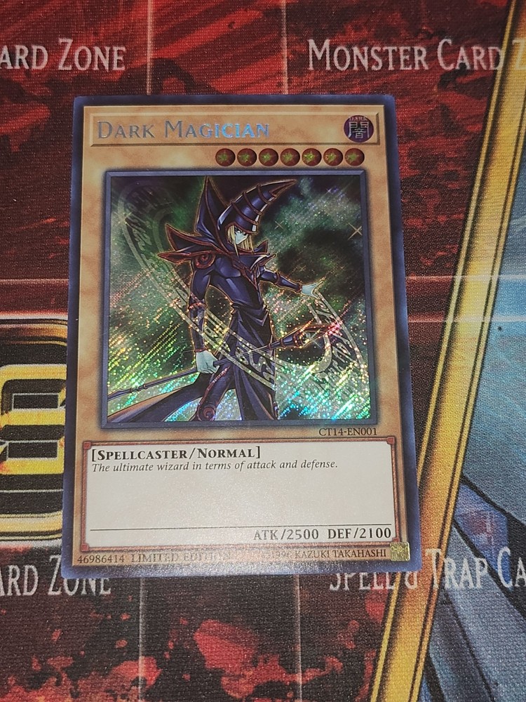 The "Dark Magician" card is from the 2017 Mega-Tins Limited Edition set in the Yu-Gi-Oh! TCG. It is a Secret Rare Spellcaster creature with 2500 Attack and 2100 Defense. Manufactured by Konami, this English-language card has the card number CT14-EN001. It is a highly sought-after collectible for fans of the game. We understand that the condition of the card is important to collectors, but rest assured that this card has been sleaved and protected. Add this powerful card to your collection today and show off your Yu-Gi-Oh! TCG prowess. Please note that this item is sold as is, with the condition shown in photos and description. We invite you to browse our full range of Yu-Gi-Oh! cards and add this rare gem to your collection today.