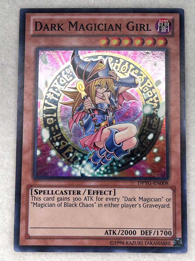 The product is a vintage 2006 Dark Magician Girl card from the Yu-Gi-Oh! TCG set. It is a Super Rare card made of card stock with a foil finish. The card features the Magician creature type with an Attack/Power of 2000 and Defense/Toughness of 1700. This English-language card is a standard size and is not autographed, making it a sought-after collectible for fans of the game.