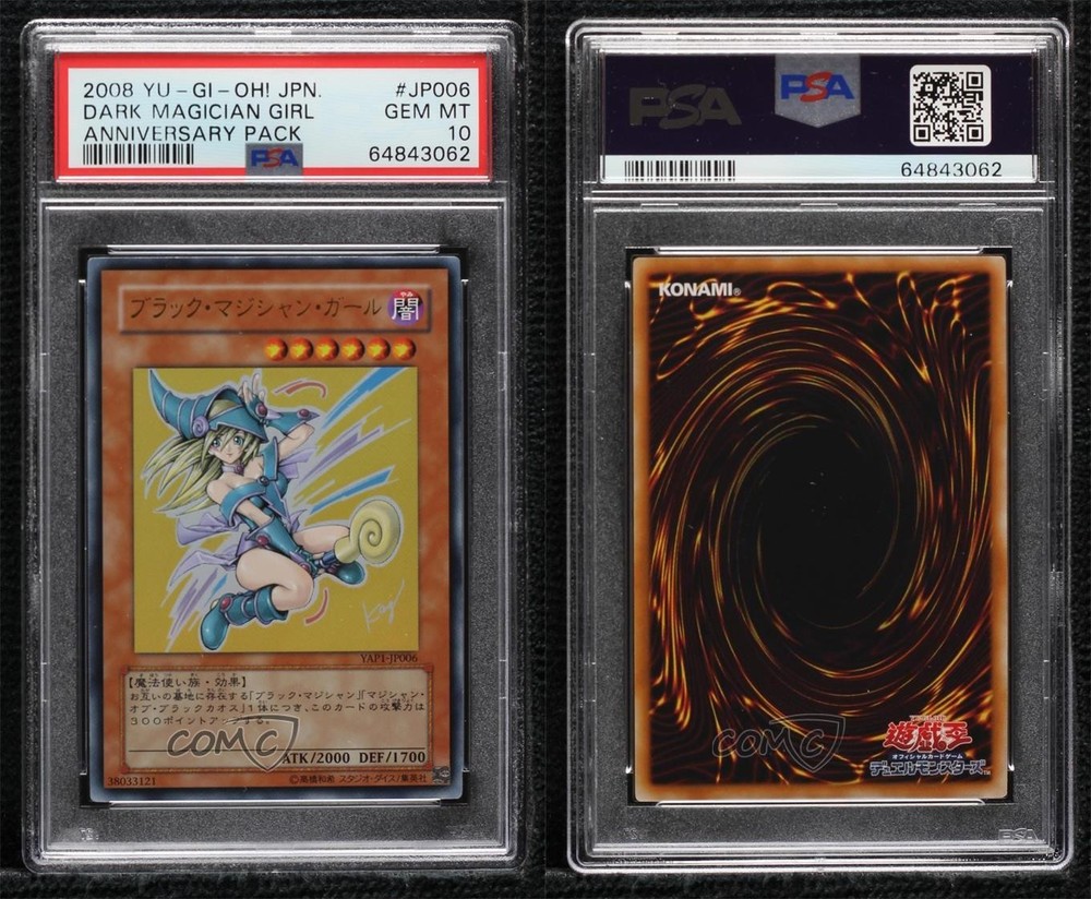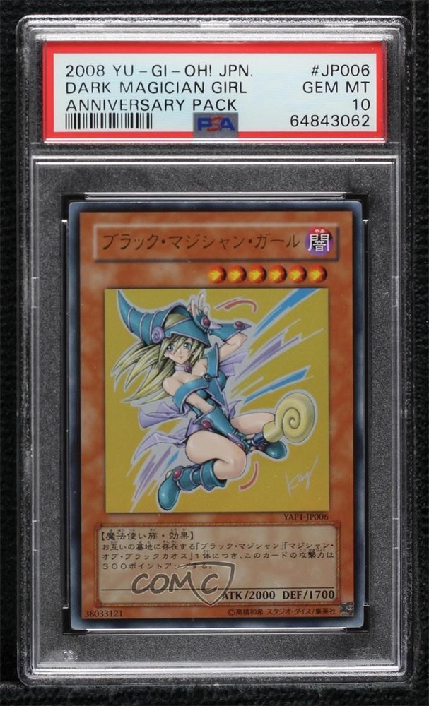 2008 Yu-Gi-Oh! Anniversary Pack - [Base] - Japanese #YAP1-JP006 Dark Magician Girl Graded PSA 10 GEM MT COMC Item: 128507139 - YuGiOh Card - Featuring Dark Magician Girl Search for more: 2008 Yu-Gi-Oh! Anniversary Pack Search for more: 2008 Yu-Gi-Oh! Anniversary Pack - [Base] - Japanese View all of our Listings Auctions Buy It Now About Us Located in the beautiful Pacific Northwest, COMC (Check Out My Cards) is the world's largest consignment service for trading card singles. More than 10,000 people have used our consignment service to list over 50 million trading cards. Find out how we can help you consign your items on eBay by contacting us through eBay messaging. COMC -- "The Safe & Easy Way to Buy & Sell" Raw Condition for Modern Cards Unless otherwise noted, raw modern cards are listed in Near Mint-Mint condition or better. A NM-MT card appears to be Mint at first glance, but upon closer inspection, may exhibit some of the following: minor print defects (e.g. roller marks, print line, dimple), minor scratches, slight edge wear, and slight corner wear. Centering is clearly visible in the images provided and does not factor into our condition assessment. Raw Condition for Vintage Cards Unless otherwise noted, raw vintage cards are listed in Excellent condition or better. An EX card may exhibit some of the following: minor rounding of corners, surface wear, print defects, light scratches, and slight edge wear/chipping. Centering is clearly visible in the images provided and does not factor into our condition assessment. Domestic Shipping Combined shipping for multiple items is available. To receive combined shipping, please ensure all desired items are in your eBay shopping cart before proceeding to checkout. eBay limits orders to 40 items per order. We automatically combine multiple orders placed on the same day. If you place multiple orders on the same day, please contact us to request a refund of applicable shipping costs. Signature confirmation may be required on invoices over $400. All cards are protected and shipped securely. International Shipping COMC offers eBay's International Shipping (EIS) for international orders under $2,500* (see country exceptions below). All duties and import fees are paid at checkout; in the rare event that there are additional import fees upon delivery, these are borne by the buyer. EIS packages route through a shipping hub in Erlanger, KY before shipping to their final destination. Please note that EIS does not allow for combined shipments. The shipping rates are determined by eBay and cannot be adjusted. *Maximum sale price exceptions: Colombia, Kuwait ($2,000); Taiwan ($1,539); Chile, Costa Rica, Guatemala, Honduras, Trinidad and Tobago ($1,000); Antigua and Barbuda, Aruba, Belize, Dominica, Grenada, Philippines, Saint Kitts and Nevis, Saint Lucia, Montserrat, Turks and Caicos Islands ($500); Dominican Republic, El Salvador ($200). Please request a shipping quote through eBay messaging for orders that exceed the maximum sale price supported by eBay's International Shipping. You will be responsible for all duties and import fees for international orders shipped outside the EIS. All cards are protected and shipped securely. Payment COMC does not accept offers on our cards through our eBay storefront. COMC utilizes eBay’s managed payments system. If you are experiencing difficulties making a payment, please contact eBay for assistance. Return Policy Returns are only accepted on the rare occasion the item is not as described. If you are making a return, please initiate the return process through eBay so a mailing label can be provided for you. Prior to listing, our expert team carefully assessed this item to represent it accurately. Please review the description and high-definition images prior to purchasing to ensure this item meets your satisfaction. We welcome you to contact us if you have further questions about this item. Trust and Integrity COMC carefully assesses each item consigned to us to prevent fraudulent items from entering the marketplace. If you believe an item offered on COMC may be fraudulent, please contact us with details so we can investigate the issue. Items we determine are outside our supported items policy may be removed. Last Modified: 6/2/2025 2:35:51 AM PDT