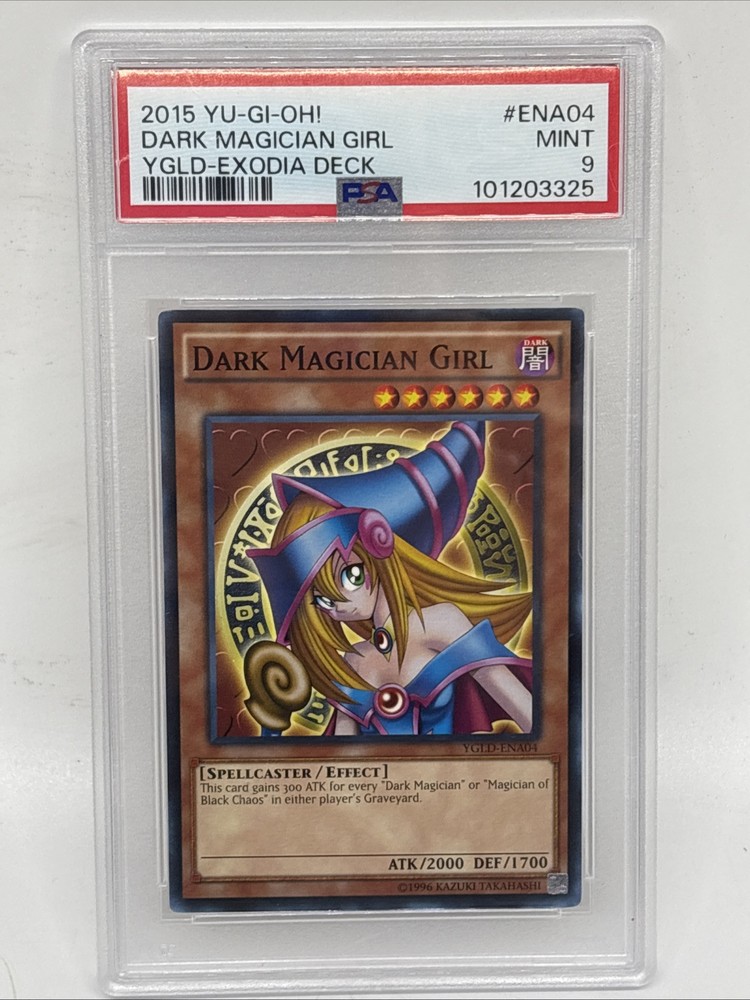 The product is a Dark Magician Girl card from the Yu-Gi-Oh! TCG's - Yugi - set. It features the character Yami Yugi and has the Creature/Monster Type of Human and Spellcaster. The card is autographed and has a PSA 9 Mint grading. The card number is YGLD-ENA04 and it is manufactured by Konami.