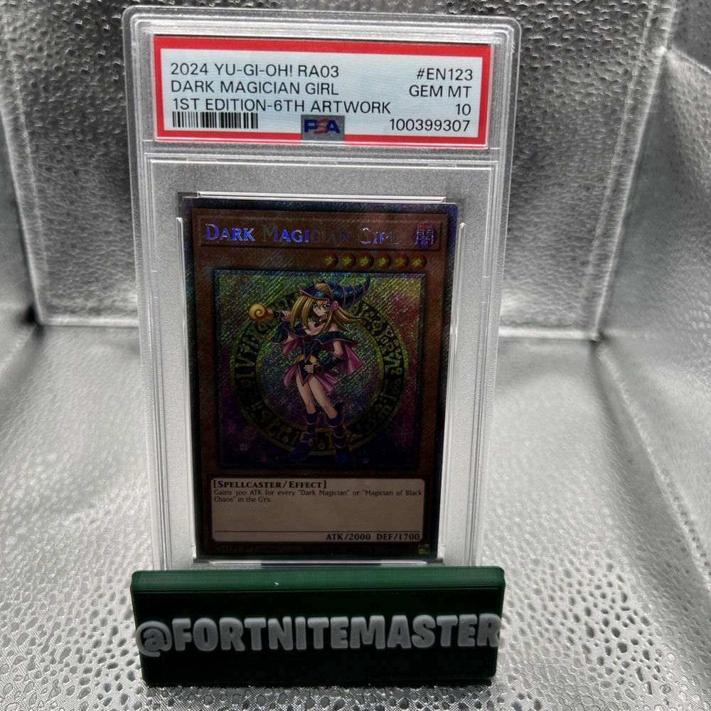 This Dark Magician Girl Platinum Century Secret Rare is an absolute gem for any Yu-Gi-Oh! enthusiast! The stunning holographic finish and pristine PSA 10 grading make it a must-have for serious collectors. Its powerful 2000 ATK and 1700 DEF stats, combined with the ultra-rare Quarter Century rarity, ensure it stands out both in battles and display cases. The 1st Edition marking and perfect condition elevate its value even further. Whether you're dueling or collecting, this Konami masterpiece delivers incredible quality and nostalgia. A true centerpiece for any Yu-Gi-Oh! fan!
