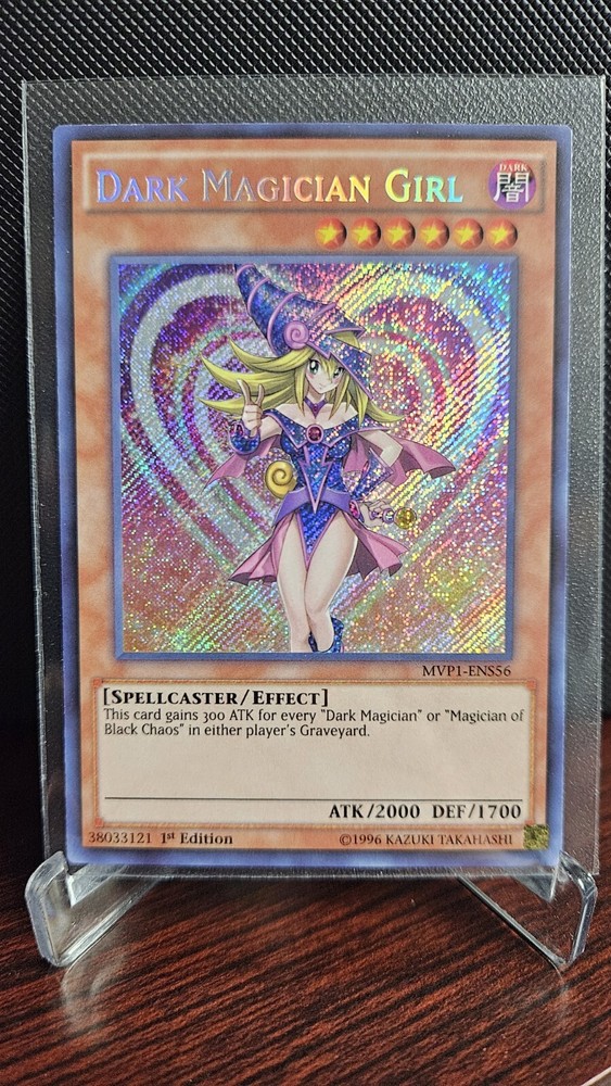 Dark Magician Girl - The Dark Side of Dimensions Movie Pack: Secret Edition (MVP1-ENS) Product Details Gains 300 ATK for every "Dark Magician" or "Magician of Black Chaos" in the GY. Number: MVP1-ENS56 Rarity: Secret Rare Attribute Monster Type/Card Type: DARK Spellcaster/Effect Monster Level: 6 A / D: 2000 / 1700
