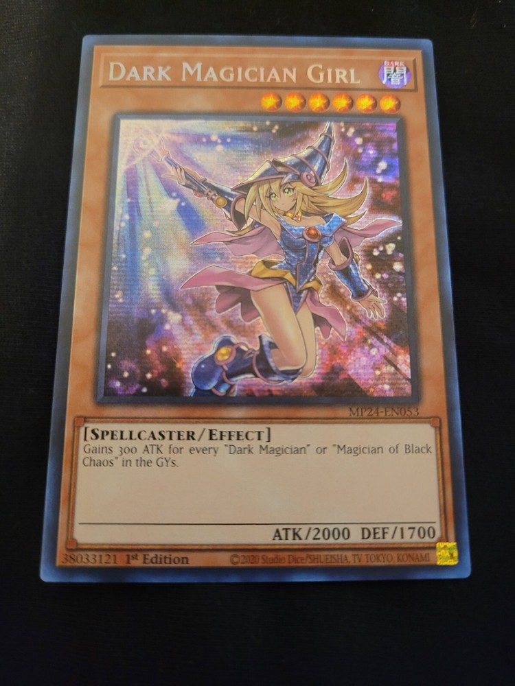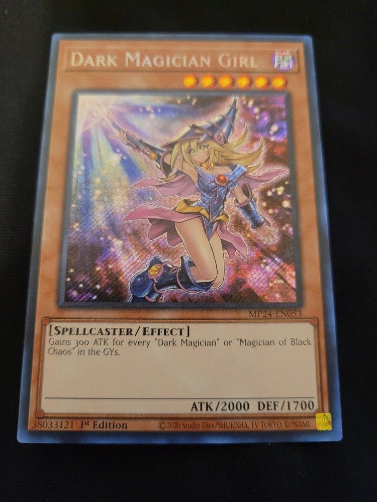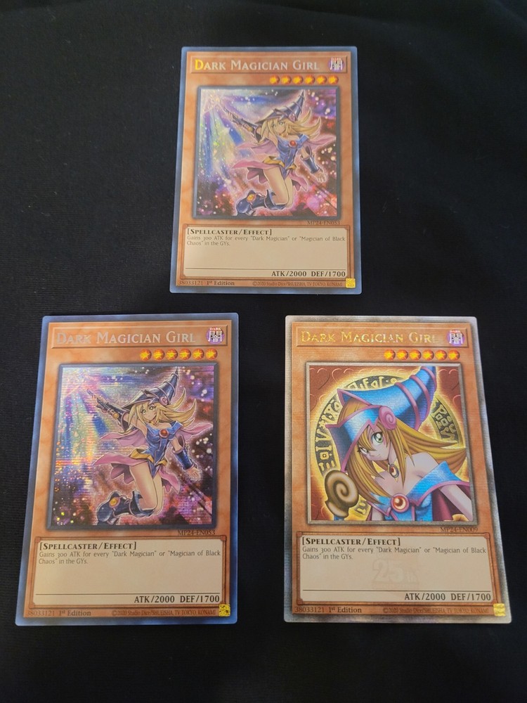 Dark Magician Girl Set MP24-EN053/ MP24-EN009 With *Misprint* Secret Rare -NM. Set of 3 Dark Magician Girl cards from the 2024 25th Anniversary Dueling Mirrors Tins: • 1x Alternate Art with error/ misprint Secret Rare foiling (diagonal foiling) MP24-EN053 • 1x Alternate Art with Prismatic Secret Rare foiling (horizontal foiling) MP24-EN053 • 1x Quarter Century Secret Rare with the original Magician's Force Artwork MP24-EN009 This is a great collector set that will look great in any binder. Current estimates for the number of error secret rares are around 5% of the total batch printed for this set. With a pool of 100 different secret rares, the odds of pulling these cards are very low. All cards will be shipped in a sleeve and individual toploaders in a team bag to ensure all cards are protected. Items will be shipped via USPS Ground advantage. If ordering multiple items, items may be combined into a larger package. My goal is to have your orders processed same day or next day. Please check out my other listings for other Yu-Gi-Oh products or Pokemon Products.
