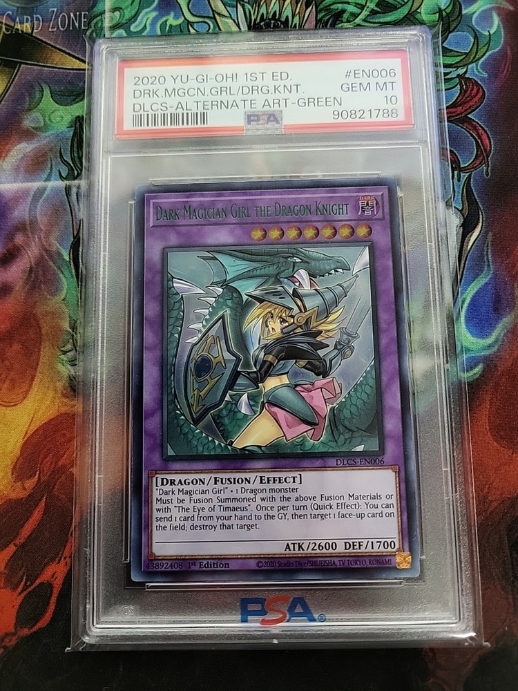 This rare and highly sought-after Yu-Gi-Oh! TCG card features Dark Magician Girl in her Dragon Knight form, with stunning alternate art and a green color scheme. The card is from the Dragons of Legend: The Complete Series set and has a card number of DLCS-EN006. With an attack/power of 2600 and a defense/toughness of 1700, this Effect and Fusion type card is a formidable addition to any player's deck. It is an Ultra Rare card, 1st Edition, and has been manufactured by Konami. This card is perfect for collectors and players alike, and is sure to make a great addition to any collection.