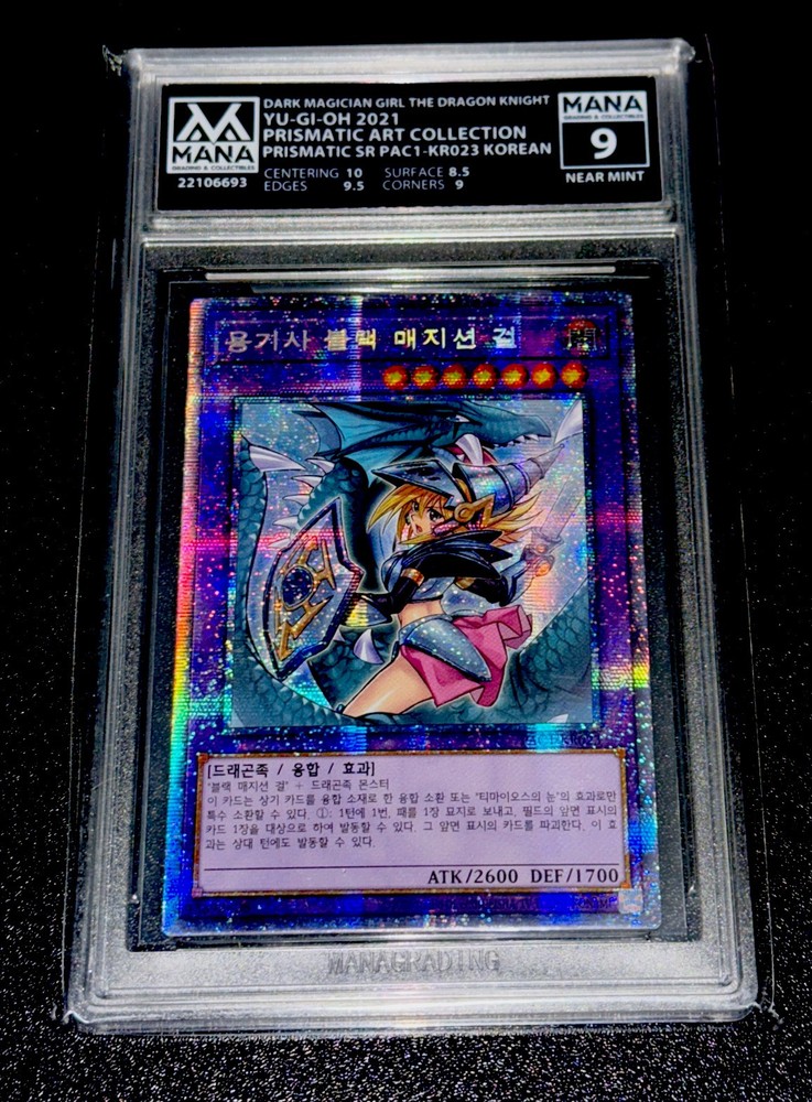 Dark Magician Girl the Dragon Knight is a Korean YuGiOh card from the Prismatic Art Collection.Graded by MANA Grading. Manufactured by Konami in 2020, this Super Parallel Rare card features the character Dark Magician Girl in her Dragon Knight form. The card is made of Card Stock with a Japanese size and a Holo finish. It is part of a chase set and is written in Korean.