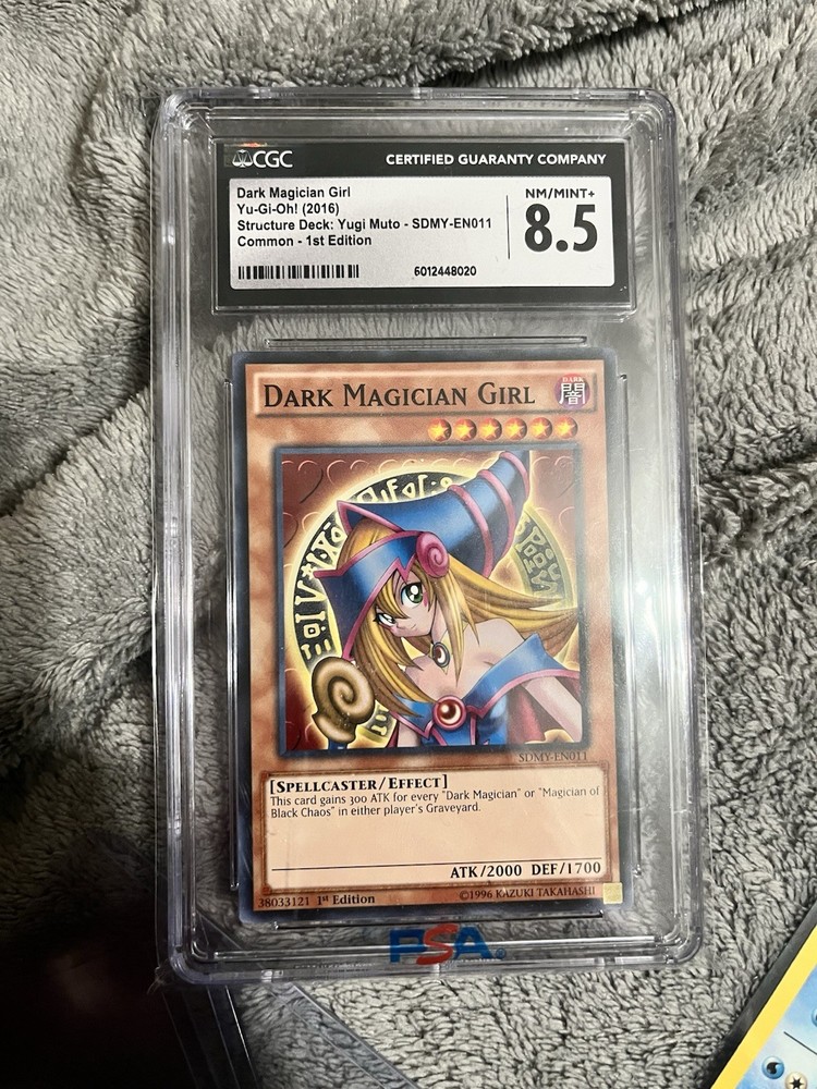 The Dark Magician Girl card is a valuable collectible in the Yu-Gi-Oh! TCG. Manufactured by Konami in the United States, this 1st Edition card features the Darkness attribute and belongs to the Spellcaster creature type. Graded at 8.5 by Certified Guaranty Company (CGC), this card is made of card stock with a holo finish, making it a sought-after item for collectors of rare and unique cards.
