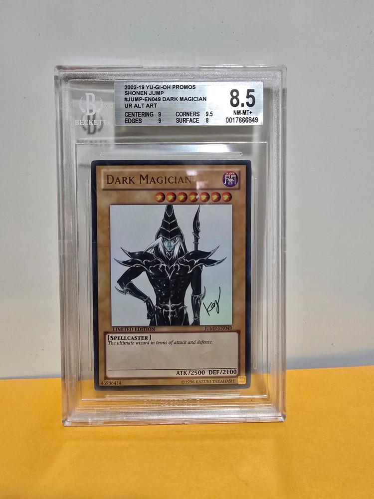 The product is a Dark Magician card from the Yu-Gi-Oh! TCG, specifically the Dark Magician JUMP-EN049 from the set. It has been professionally graded by BGS with a grade of 8.5. The card is a Monster type card with the attribute of Darkness. The certification number is 0017666849. This collectible card game item is highly sought after by players and collectors alike for its rarity and value.