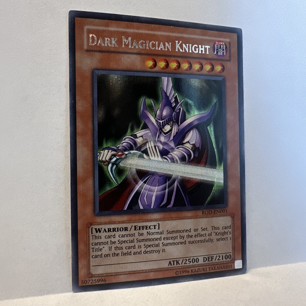 Enhance your Yu-Gi-Oh! TCG collection with the elusive Dark Magician Knight card, a gem from the Reshef of Destruction Promotional Cards set. Bearing the unique card number ROD-EN001, this collectible features the enigmatic Dark Magician Knight character, renowned for its mystical prowess in the game's universe. Its Super Parallel Rare status ensures its standout presence in any assortment. Crafted with quality card stock and boasting a captivating Holo finish, this English-language card dates back to 1996 and is a must-have for both seasoned collectors and enthusiasts. With an impressive 2500 attack power and 2100 defense toughness, it's ready to take on any challenge in your next duel. Embrace the Dark with this iconic Yu-Gi-Oh! treasure.