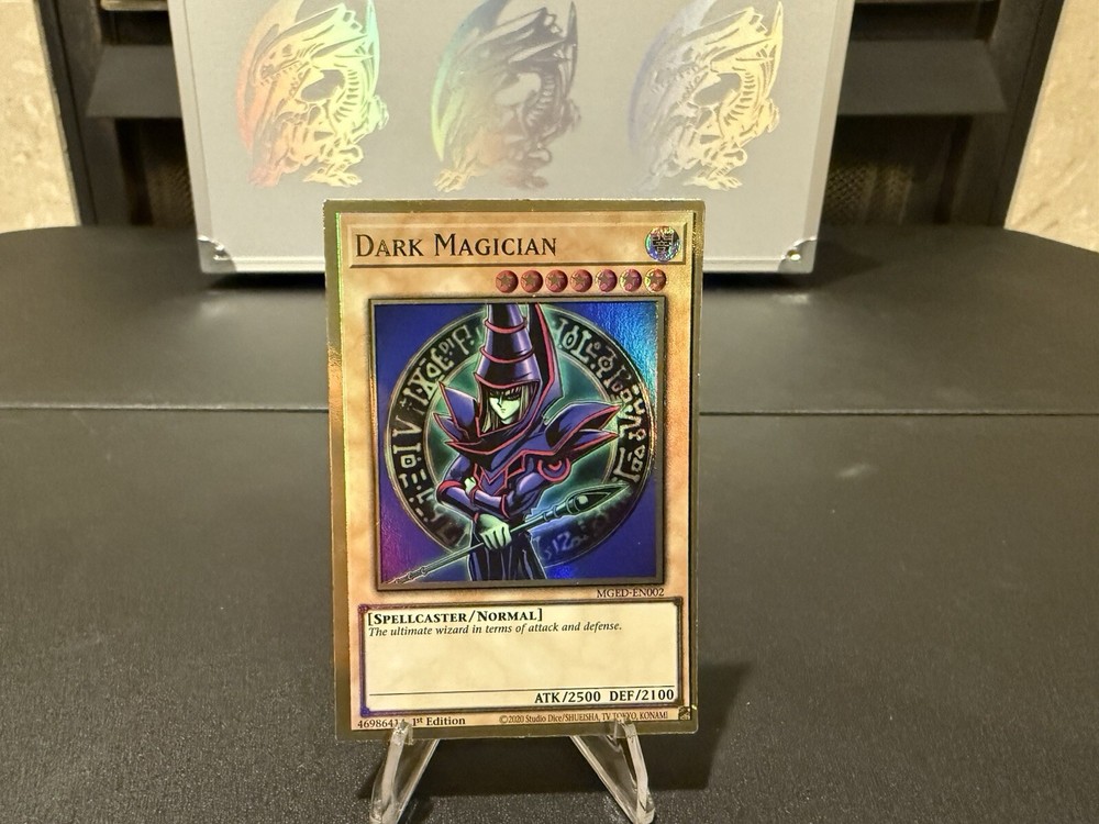 The "Dark Magician" card is from the Maximum Gold: El Dorado set in the Yu-Gi-Oh! TCG. This Premium Gold Rare card features the Spellcaster monster type with 2500 Attack and 2100 Defense. It is a 1st Edition card with a Dark attribute and belongs to the Normal card type. Manufactured by Konami, this English language card is a highly sought-after collectible for fans of the game.