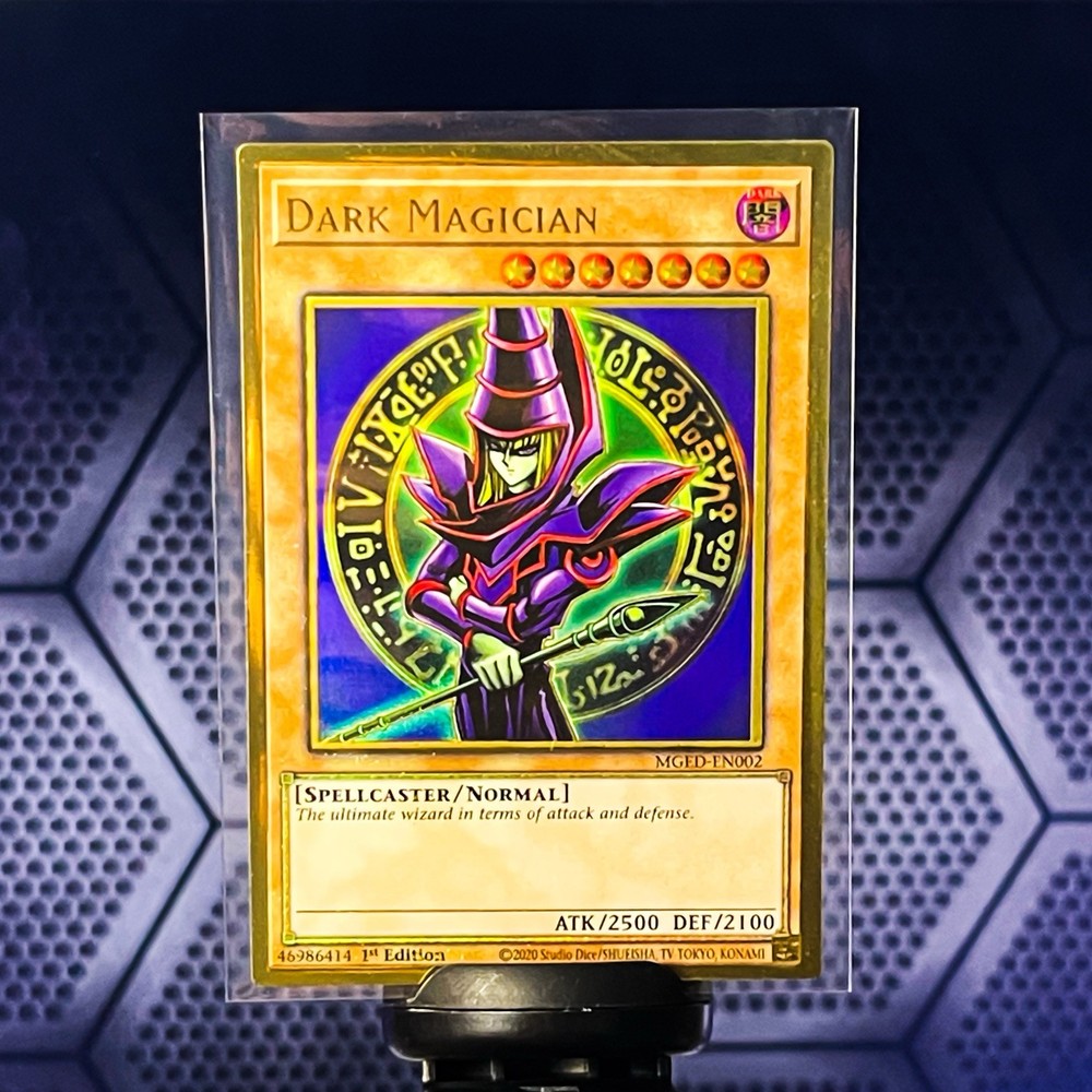 The product is a Dark Magician card from the Yu-Gi-Oh! trading card game, specifically from the Maximum Gold: El Dorado set. This particular card is a Premium Gold Rare 1st Edition version, denoted by the MGED-EN002 card number. The Dark Magician is a powerful and iconic card in the game, known for its impressive abilities and high value among collectors. This Near Mint version is likely in excellent condition, making it a sought-after addition to any Yu-Gi-Oh! card collection.