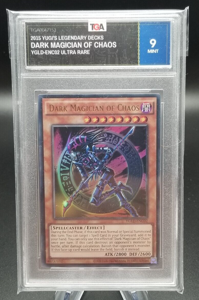 Dark Magician Of Chaos YGLD-ENC02 YuGiOh Yugi's Legendary Decks Graded - 9 MINT BEAUTIFUL COPY OF CARD!! We will combine shipping on multiple items so please check our store before leaving! Lots of great items up...always new items being added. Thanks for looking. PLEASE NOTE: Many of our graded card images look a tad blurry. The cards & slabs are FINE. In our attempt to keep the slabs pristine, after grading, we DO NOT REMOVE the plastic sleeve they are in for our pictures. We do not want to scratch your slab! We assure you these are even more pristine than the image shows. Thanks! ADDED FREE SHIPPING ON THIS LISTING, FOR A LMITED TIME!