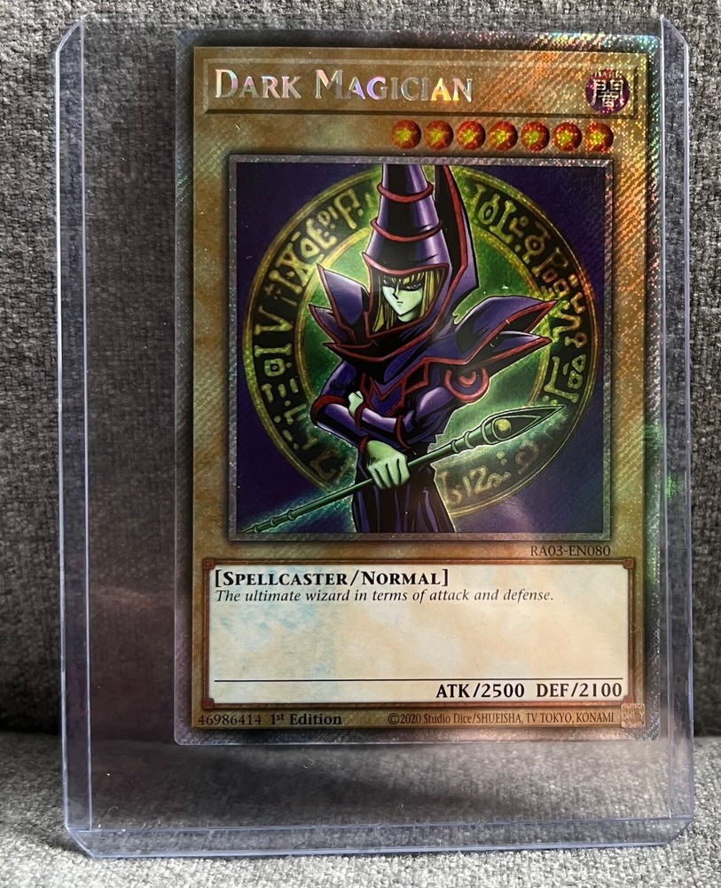 Elevate your Yu-Gi-Oh! TCG collection with the iconic Dark Magician card from the Quarter Century Bonanza set. As a Quarter Century Secret Rare card numbered RA03-EN080, this piece boasts an impressive 2500 attack power and 2100 defense toughness, making it a formidable addition to any deck. The card features the spellcaster creature type and the dark attribute, fitting for those who specialize in strategic dark-themed builds.The card comes in its 1st Edition release, ensuring its authenticity and value to collectors. With English language printing by Konami, the Dark Magician card is a must-have for both players seeking to enhance their game and collectors looking to treasure a piece of Yu-Gi-Oh! history.