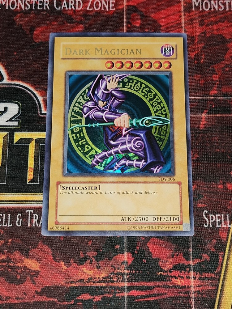The product is a Dark Magician card from the Starter Deck: Yugi for the Yu-Gi-Oh! Trading Card Game. It is an Ultra Rare card with 2500 Attack and 2100 Defense. The card is in English and manufactured by Konami. It is a Normal Spellcaster monster with the card number SDY-006. We understand that the condition of the card is important to collectors, but rest assured that this card has been sleaved and protected. Add this powerful card to your collection today and show off your Yu-Gi-Oh! TCG prowess. Please note that this item is sold as is, with the condition shown in photos and description. We invite you to browse our full range of Yu-Gi-Oh! cards and add this rare gem to your collection today.