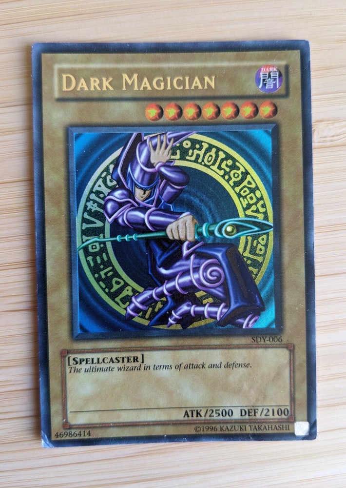 Dark Magician SDY-006 Yugioh Yu Gi Oh! Unlimited Foil Ultra Rare MP. Corners are scuffed when viewed from the back, but damage is only visible from one side on the front. Let me know if you'd like additional photos.