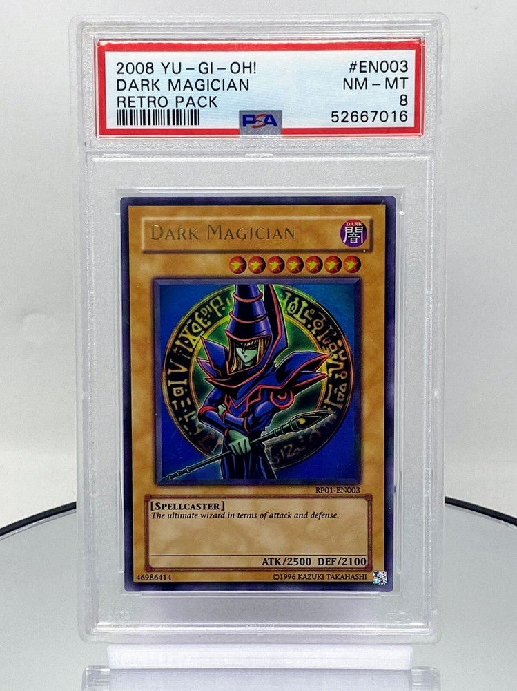 WELCOME TO OUR EBAY STORE! We are a Table-top game store located in Wilmington, North Carolina with a wide selection of Board Games, Card Games, RPGs, Miniatures, and more! We ship out any orders placed before 3pm EST the same day they are placed, Monday-Friday! *Orders placed over the weekend will be marked as shipped, but will not be received by the postal service until Monday morning. This listing is for 1x Dark Magician - Unlimited - PSA 8 from Retro Pack in NM-Mint condition. Condition: NM-Mint Finish: Holo Set: Retro Pack We use TCGPlayer's condition guide to grade each of our cards, descriptions of each condition and what kind of wear to expect can be found below. Unique traits, such as an artist's official signature, will be excluded from the grading process. CONDITION GUIDE: Near Mint (NM) Cards in Near Mint condition show minimal wear from shuffling, play or handling and can have a nearly unmarked surface, crisp corners and unblemished edges outside of a few slight flaws. A Near Mint card may have slight edge wear or a scratch or three, but overall look nearly unplayed with no major defects. The acceptable range of cards within the Near Mint condition includes both cards with no imperfections and cards with a few slight imperfections. Lightly Played (LP) Cards in Lightly Played condition may have minor border or corner wear, scuffs or scratches. There are no major defects such as grime, bends or issues with the structural integrity of the card. Noticeable imperfections are okay, but none should be too severe or at too high a volume. The acceptable range of cards within the Lightly Played condition includes both cards with few or a handful of minor imperfections. Moderately Played (MP) Cards in Moderately Played condition can have border wear, corner wear, scratching or scuffing, creases or whitening or any combination of moderate examples of these flaws. A Moderately Played card may have some form of imperfection impacting a small area of the card from mishandling or poor storage, such as creasing that doesnʼt affect card integrity, in combination with other issues such as scratches, scuffs or border/edge wear. Heavily Played (HP) Cards in Heavily Played condition show a major amount of wear. Cards can show a variety of moderate imperfections along with creasing, whitening and bends. Heavily Played cards can also have flaws that impact the integrity of the card, but the card can still be sleeve playable. Damaged (DMG) Damaged cards show wear or imperfections beyond the standards for other conditions. Cards in Damaged condition can also exhibit an imperfection that may make the card illegal for tournament play, even in a sleeve. Cards in Damaged condition may have major border wear, corner wear, scratching or scuffing, as well as folds, creases, tears or other damage that impacts the structural integrity of the card. Any non-altering ink, water damage, or peeling will usually cause a card to be considered as Damaged condition. Looking to buy more cards? Browse our collection of available card game singles on our eBay Store Page ! Have all your cards shipped together and take advantage of our savings when you buy multiple cards in a single order!