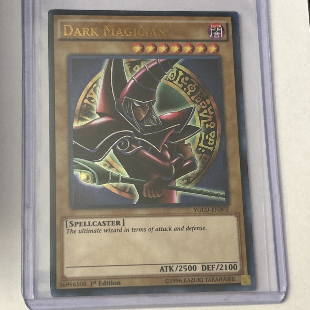 Dark Magician is an Ultra Rare 1st Edition card from the King of Games: Yugi's Legendary Decks set in the Yu-Gi-Oh! TCG. It is a Spellcaster creature with 2500 Attack and 2100 Defense. The card is in Moderately played (Very good) condition and features a Dark color scheme. It is a Normal type card with card number YGLD-ENB02, manufactured by Konami in English language.
