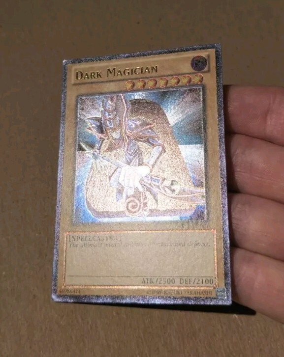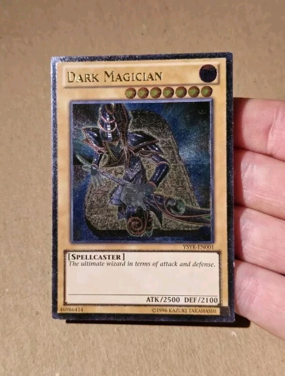 The product is a "Dark Magician" card from the Yugi Reloaded set of the Yu-Gi-Oh! TCG. It is an Ultimate Rare card with 1st Edition features, having the attributes of being a Dark Spellcaster monster with 2500 Attack and 2100 Defense. The card number is YSYR-EN001, and it is in English language. It is manufactured by Konami.