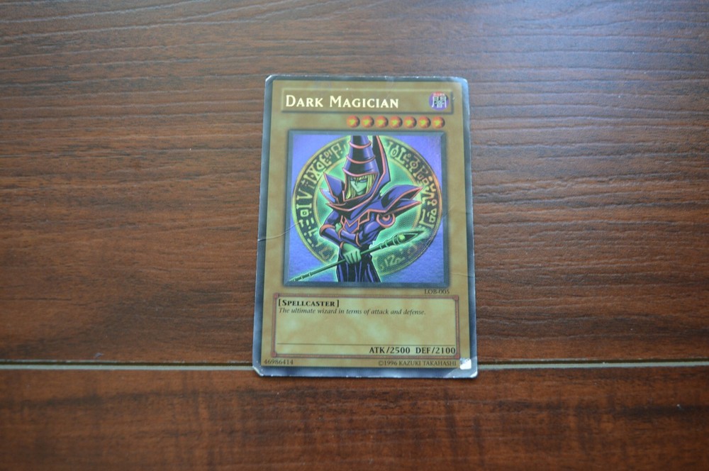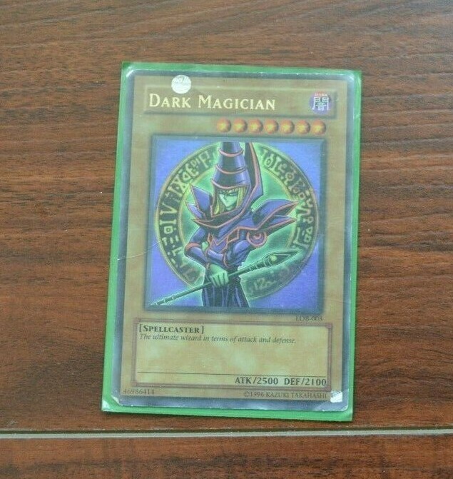 Dark Magician Yu-Gi-Oh Card with Green Cover In good condition. Card has obvious signs of wear. Ships in Canada via Canada Post Expedited or Regular Parcel Ships to US via Canada Post-US Tracked Packet No local pickup. Photos are accurate to what you receive.