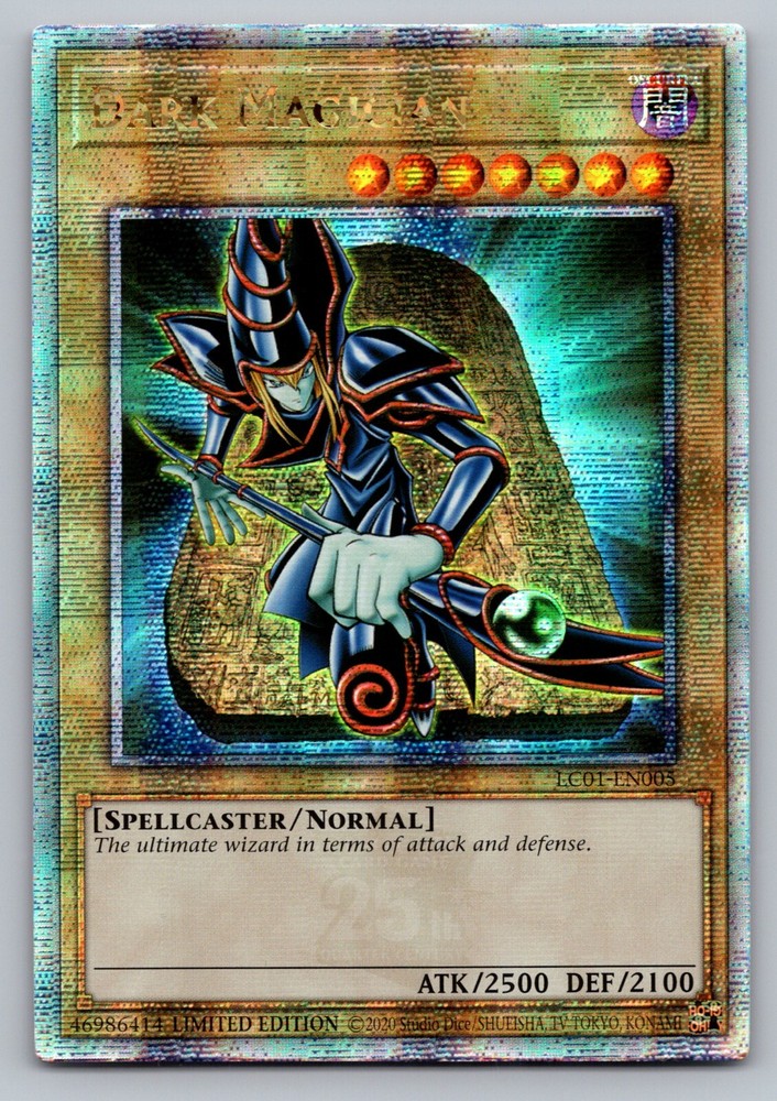 This listing is for Dark Magician LC01-EN005 (Quarter Century Secret Rare) from the Legendary Collection: 25th Anniversary Edition set . This is a stock photo as this is a bulk listing. You will receive the same card in the same condition specified , but it may not be the exact copy from the photo . Therefore, centering on the card you receive may differ from the centering of the card listed in the photo. Please be aware of this before purchasing. Each card will be in Near Mint condition. Cards in this listing may have some very minor imperfections (such as few small dots of whitening or a couple of very small scratches), but there will be no major damage to the cards (such as excessive whitening, scratches, edgewear, creases, water damage, etc). The cards from your order will be securely packaged in a card saver and card saver perfect fit sleeve and shipped with the eBay Standard Envelope program for cards under $20. Whether you're looking to power up your deck or add this to your collection, you'll be sure to enjoy this card! Check out our other listings for more Yu-Gi-Oh! cards!