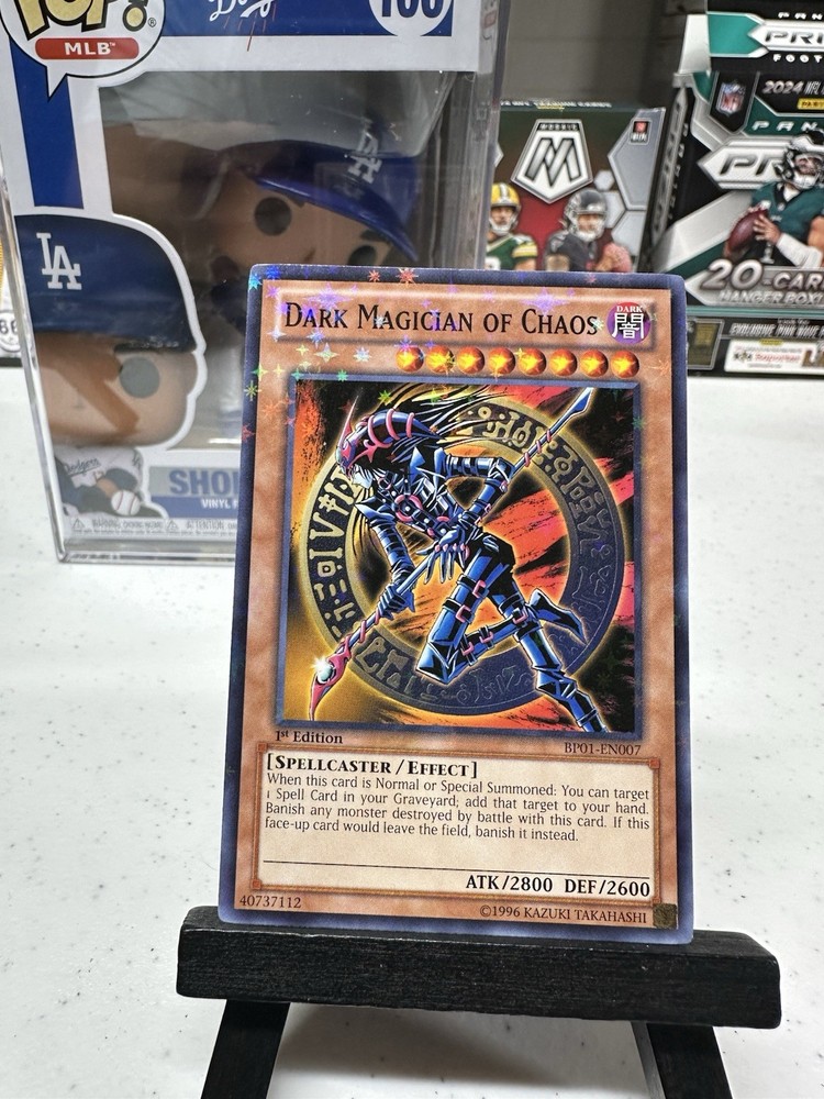 The Dark Magician of Chaos from the Starfoil Battle Pack: Epic Dawn is a rare 1st Edition Yu-Gi-Oh! card manufactured by Konami. This powerful Spellcaster has a high Defense/Toughness of 2600 and an even higher Attack/Power of 2800, making it a valuable addition to any Yu-Gi-Oh! TCG collection. Its Dark attribute and English language make it a sought-after card for collectors and players alike.