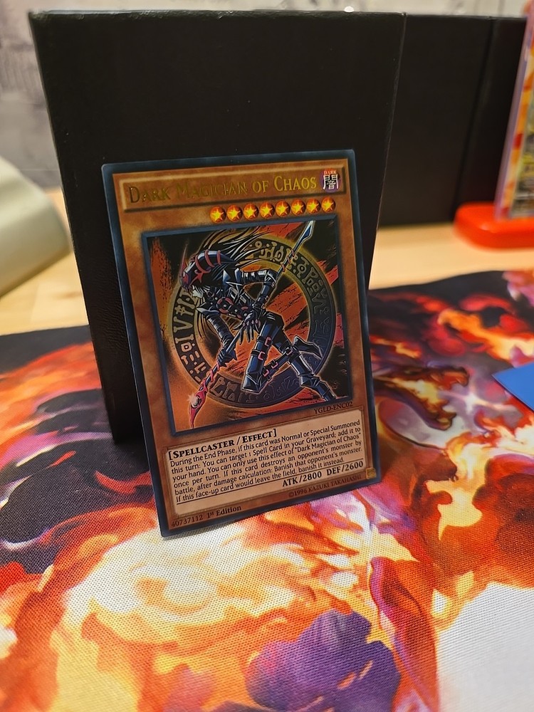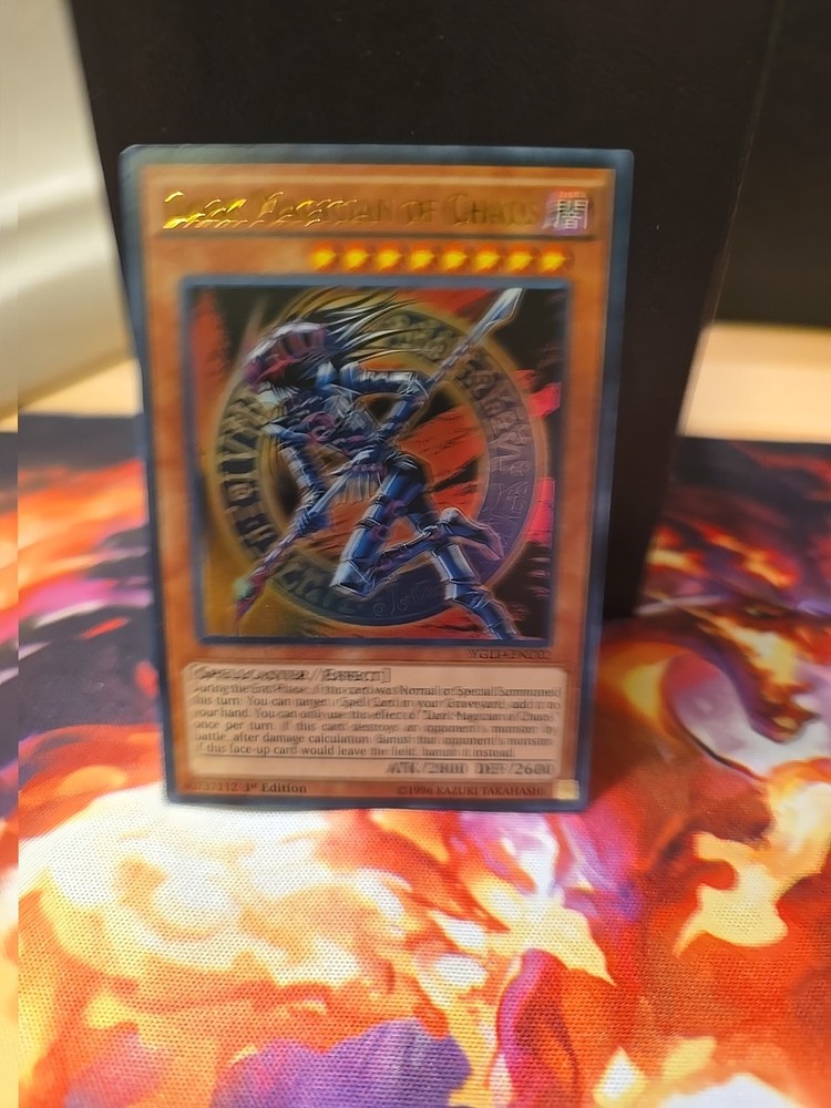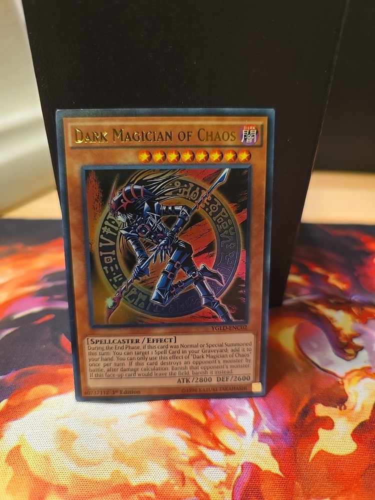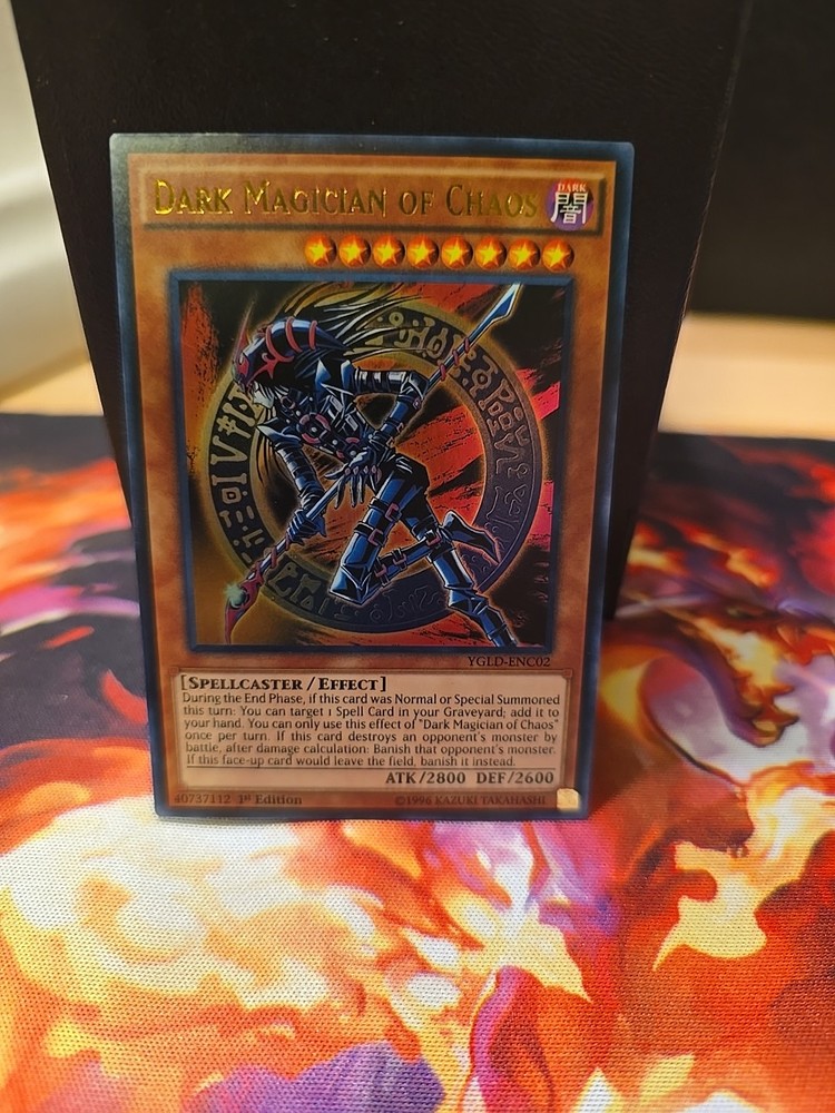 Dark Magician of Chaos is a Level 8 Dark Spellcaster card from the King of Games: Yugi's Legendary Decks set in the Yu-Gi-Oh! TCG. It has 2800 Attack and 2600 Defense. Its effect allows you to add a Spell Card from your Graveyard to your hand during the End Phase if it was Normal or Special Summoned that turn. If it destroys an opponent's monster in battle, that monster is banished.