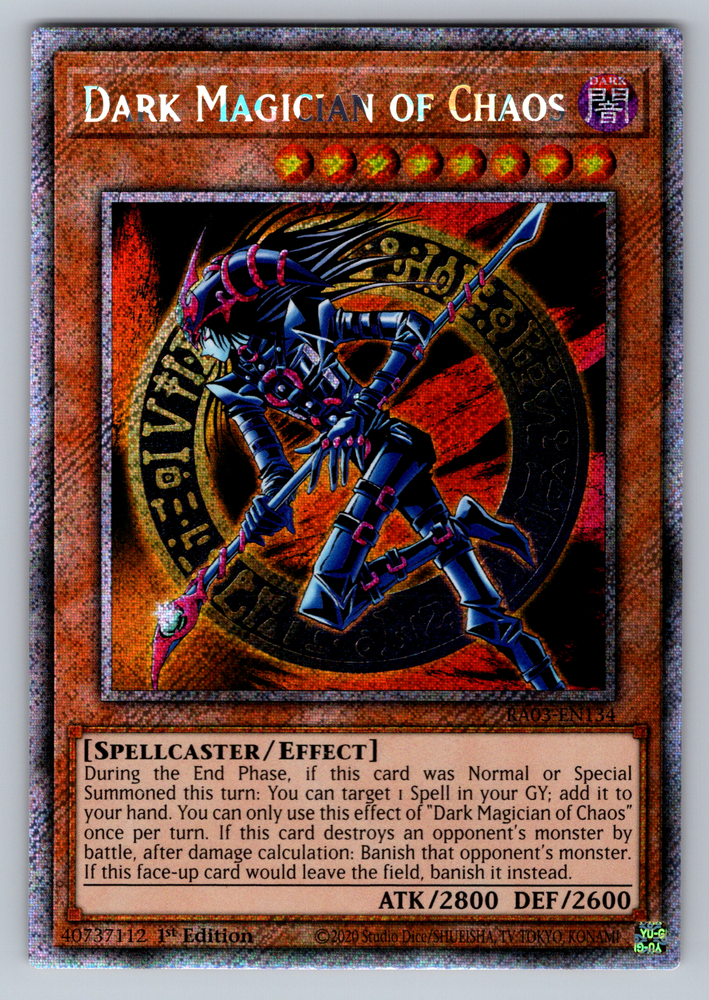 This listing is for Dark Magician of Chaos RA03-EN134 (Platinum Secret Rare) from the Quarter Century Bonanza set . This is a stock photo as this is a bulk listing. You will receive the same card in the same condition specified , but it may not be the exact copy from the photo . Therefore, centering on the card you receive may differ from the centering of the card listed in the photo. Please be aware of this before purchasing. Each card will be in Near Mint condition. Cards in this listing may have some very minor imperfections (such as few small dots of whitening or a couple of very small scratches), but there will be no major damage to the cards (such as excessive whitening, scratches, edgewear, creases, water damage, etc). The cards from your order will be securely packaged in a card saver and card saver perfect fit sleeve and shipped with the eBay Standard Envelope program for cards under $20. Whether you're looking to power up your deck or add this to your collection, you'll be sure to enjoy this card! Check out our other listings for more Yu-Gi-Oh! cards!