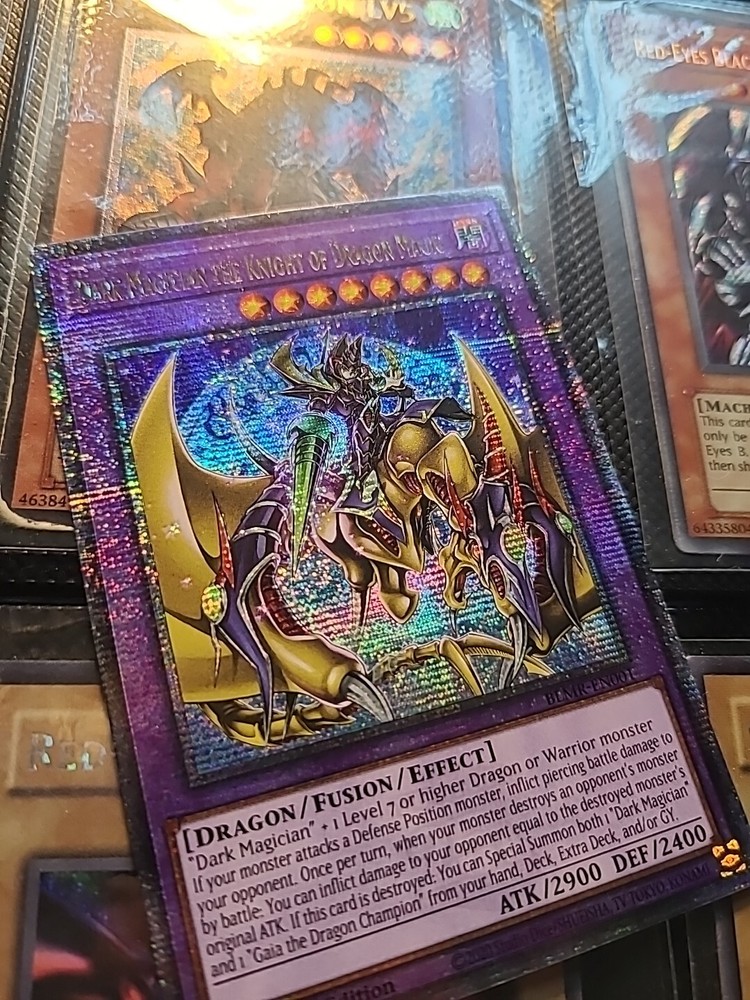 This is a highly sought-after Dark Magician the Knight of Dragon Magic BLMR-EN001 Quarter Century Rare card from the Yu-Gi-Oh! game. It features a Dark attribute and a Rare rarity, making it a valuable addition to any collection. The card name is Darkness and it is manufactured by Konami. The creature/monster type is a Magic Knight and it belongs to the Yu-Gi-Oh! character family. This collectible card game individual card is perfect for fans of the Yu-Gi-Oh! game and collectors alike. It is ideal for adding to your collection or for use in competitive play. Don't miss out on the opportunity to own this rare and valuable card.