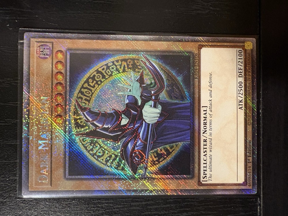 You are purchasing a set of two cards Delve into the mystical realms of the Yu-Gi-Oh! TCG with the iconic Dark Magician card from the Quarter Century Stampede set. This Platinum Secret Rare card comes in two stunning variants, each featuring the powerful Spellcaster in exquisite detail. With its holographic finish, the Dark Magician card shines as a 1st Edition piece, adding a gleam to your collection. Crafted by Konami and produced in the United States, this card is a testament to the game's rich history and the strategic depth of the Darkness attribute. The card is ungraded, ensuring you the opportunity to have it professionally assessed. It's a must-have for enthusiasts and collectors alike, seeking to enhance their game or preserve a piece of Yu-Gi-Oh! legacy.