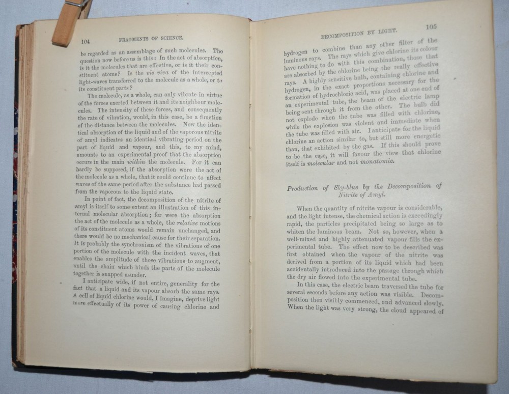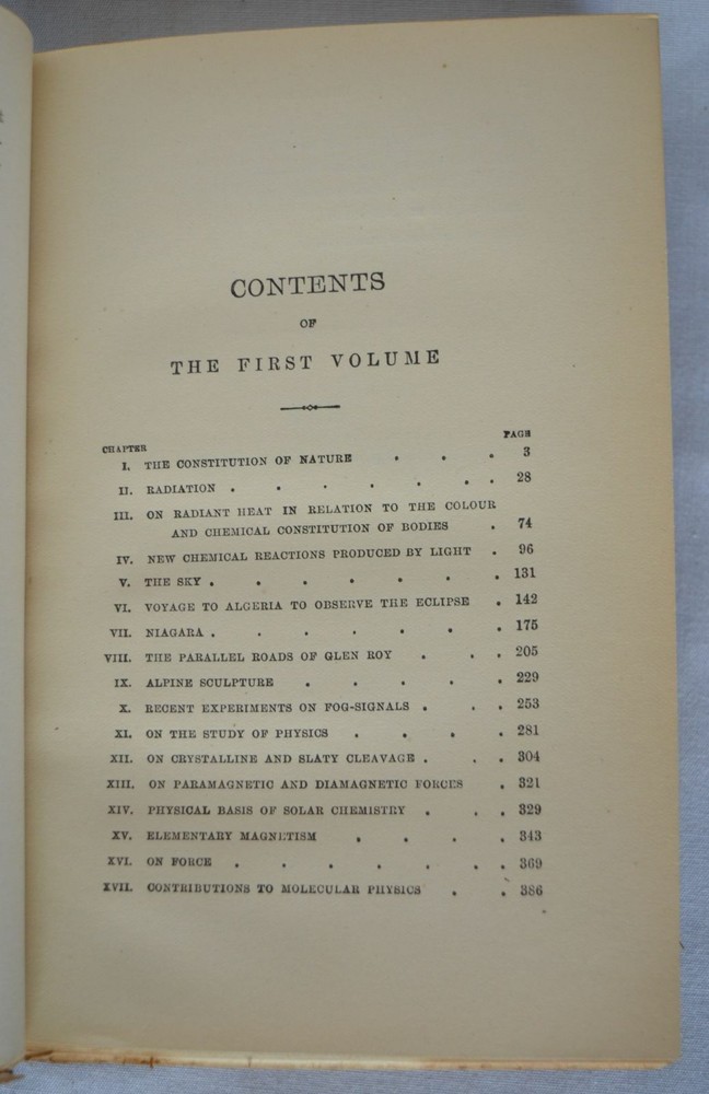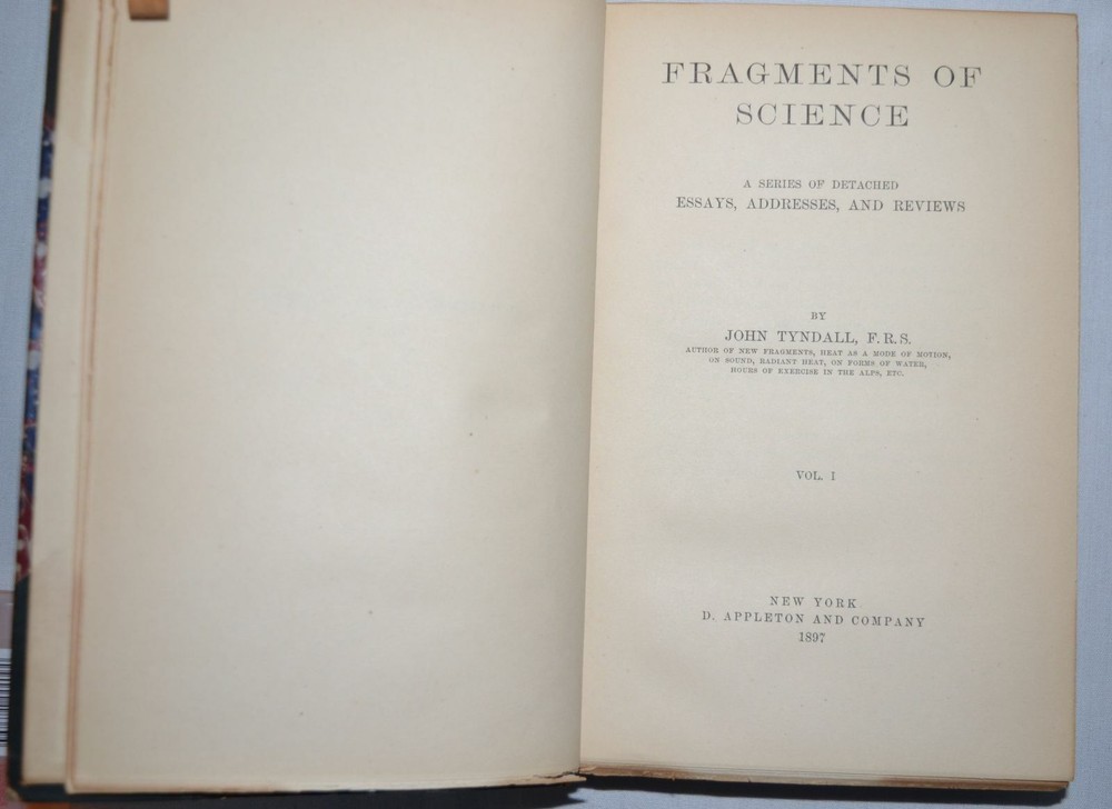 FRAGMENTS OF SCIENCE A Series of Detached Essays, Addresses, and Reviews by John Tyndall Vol. 1 Original 1897 Publication NOT a Reproduction Can be sent by Media Mail. If not first choice scroll down & select on invoice before paying. I will combine purchases within a 3 day period to save postage cost when possible. For combined shipping rates, please place all items from this seller in the shopping cart and request total before paying. After payment I cannot refund because ebay & PayPal will no longer refund sellers’ fees for buyers’ overpayments. . Description Good for 127 years old; some wear to cover, mainly on spine and corners. Pages are uniformly yellowed, but I found no darker foxing spots. Inspection found no turned down pages, no missing pages and no torn pages. The edges of the tops of the pages are gilded. Other pages are not and are not trimmed evenly which is how many books are. Book is about 8" x 5 1/2" x 1 1/4". General Conditions & Info Unless otherwise described and/or photographed, items are free of holes, stains, tears, cracks or other defects. I sell things our family no longer needs or wants and some things I make. Use the "contact seller" feature if needed. NO Returns