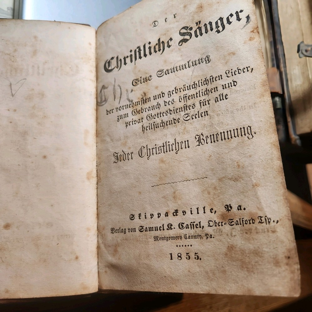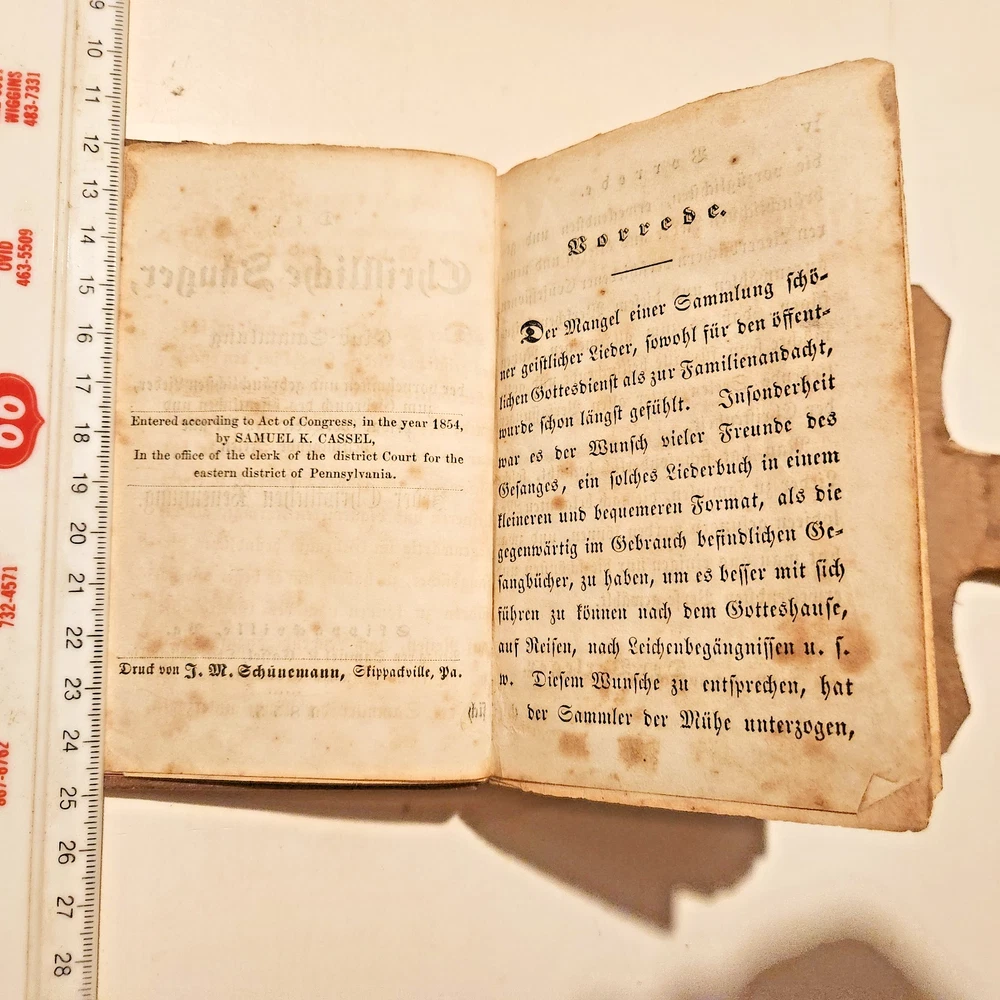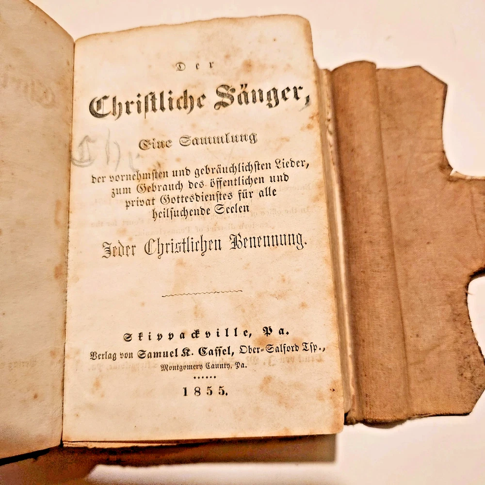 The "Der Chriftliche Sanger" is a rare and valuable 1st edition songbook published by Samuel Cassel in 1855. This leather-bound book contains a collection of religious songs in German, making it a unique and culturally significant piece for collectors of antiquarian books. With its original language and special attributes, this piece is sure to be a prized addition to any music or religious history enthusiast's collection. 5"x 3.5" 440 pages missing the leather strap on the binding