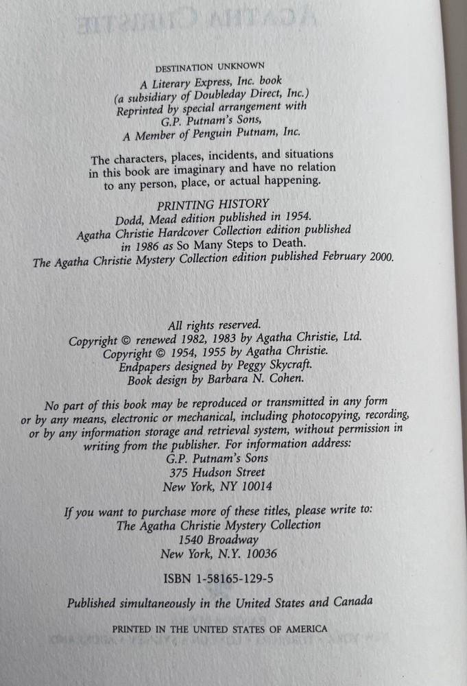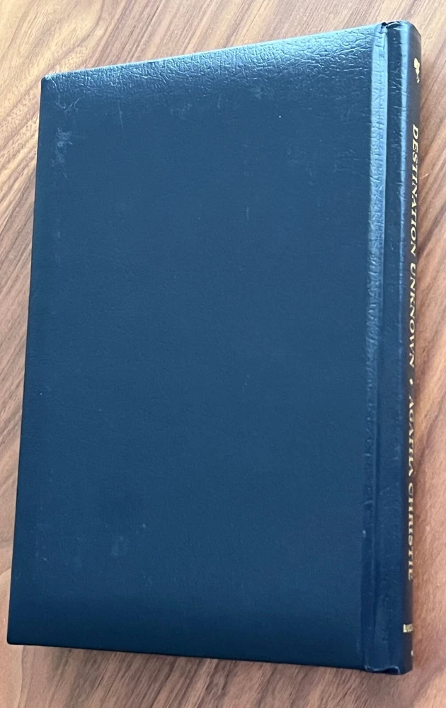 This rare Agatha Christie Mystery Collection book titled "Destination Unknown" was published in February 2000 by Bantam Books in a leatherette hardcover format. Written in English, this collectible item falls under the mystery genre and features classic detective work by the renowned author. This edition is in very good condition with a few minor scuffs on the leatherette.