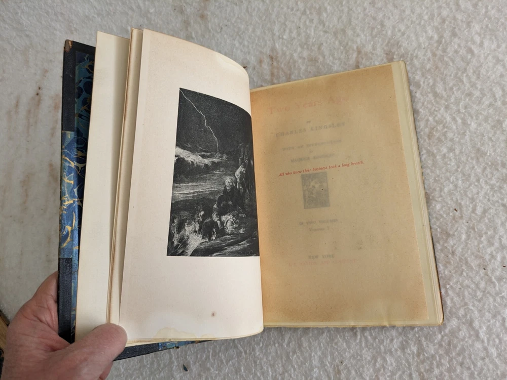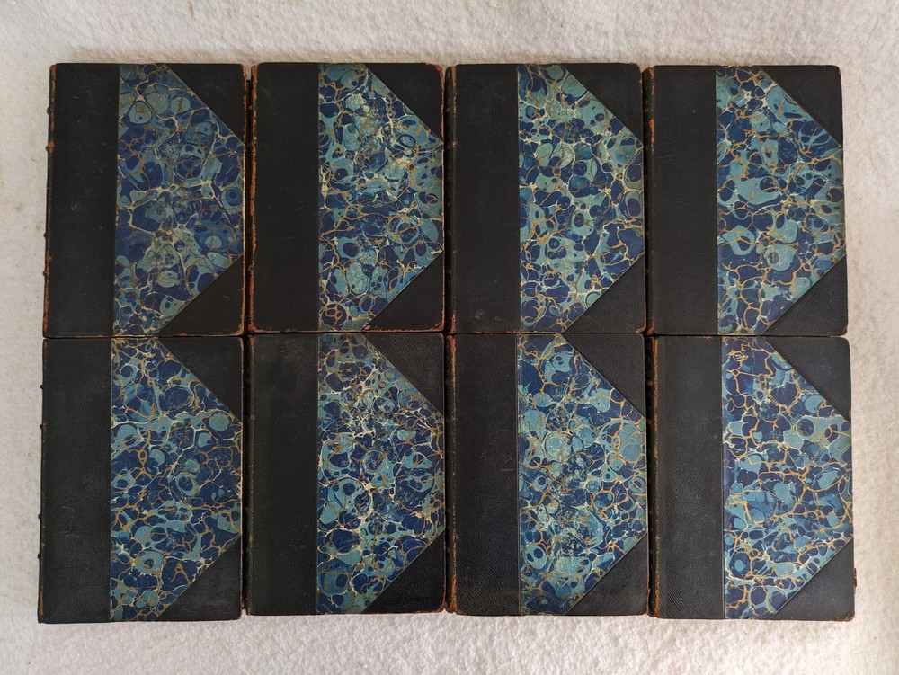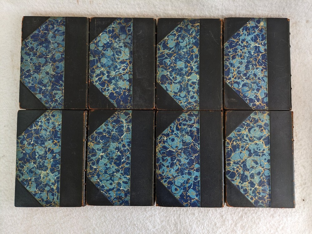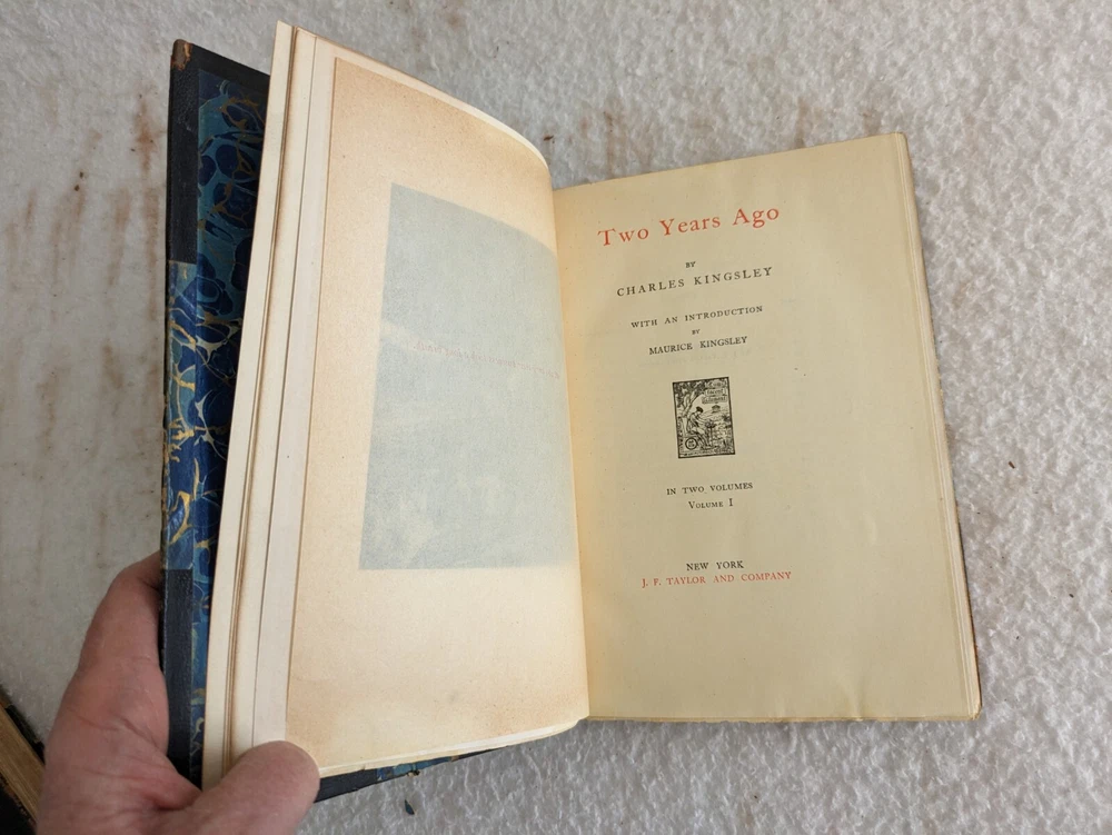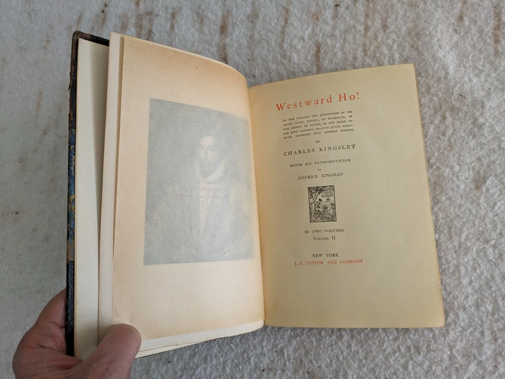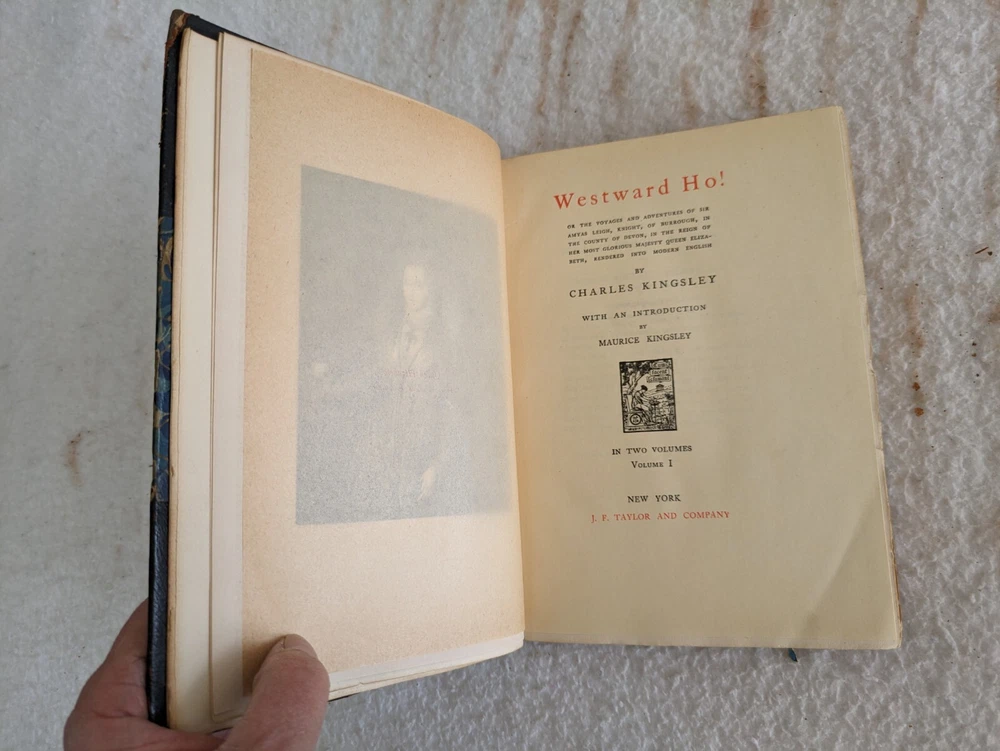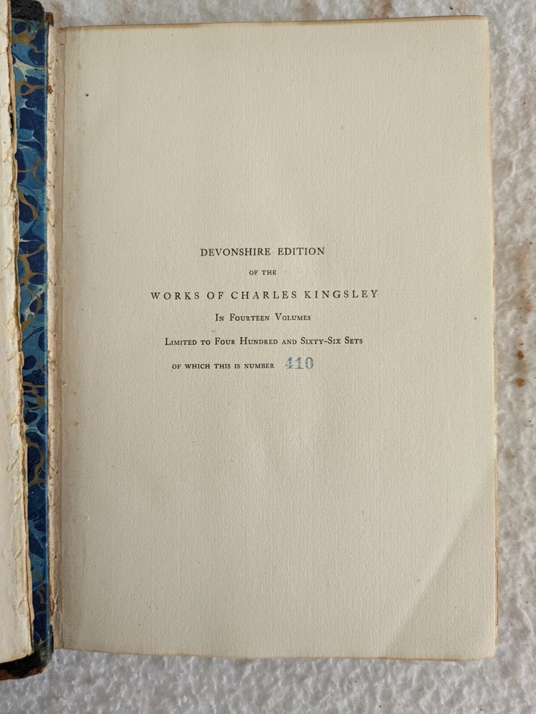The Devonshire Edition of the WORKS OF CHARLES KINGSLEY in Fourteen Volumes Of which this is number #410/466 New York: J. P. Taylor and Company, 1899 14 Half Leather Hardcovers in Fair to Good Condition. The front endpapers and two adjacent pages are loose in both volumes of WESTWARD HO! Leather is worn and splitting at the spines of both these volumes. The front cover is still attached to POEMS but the leather is splitting and the hinge is very weak and fragile. The rest of the books are edgeworn but bindings are firm. A few volumes have occasional light dampstains. No markings. Please examine photos for details. Condition: We strive to describe and photograph the condition of every item as accurately as possible. Photos are of the actual item that is being sold. Please examine the photos carefully for any condition details and possible flaws. Best Offers: We consider all offers in relation to current market values. We try to respond almost immediately to most offers. Most of our counteroffers are firm but we are open to bargaining. Shipping: We combine shipping. When ordering multiple items from us please request a total before paying. We charge postage based on weight plus $1 for each eBay listing. All of our orders are packed carefully to prevent damage during shipment. We ship most of our items within 24 hours. Contact Us: We are available 7 days a week and are happy to answer any questions you may have.