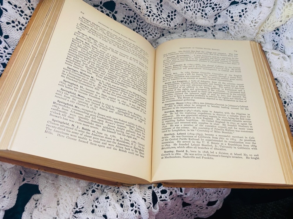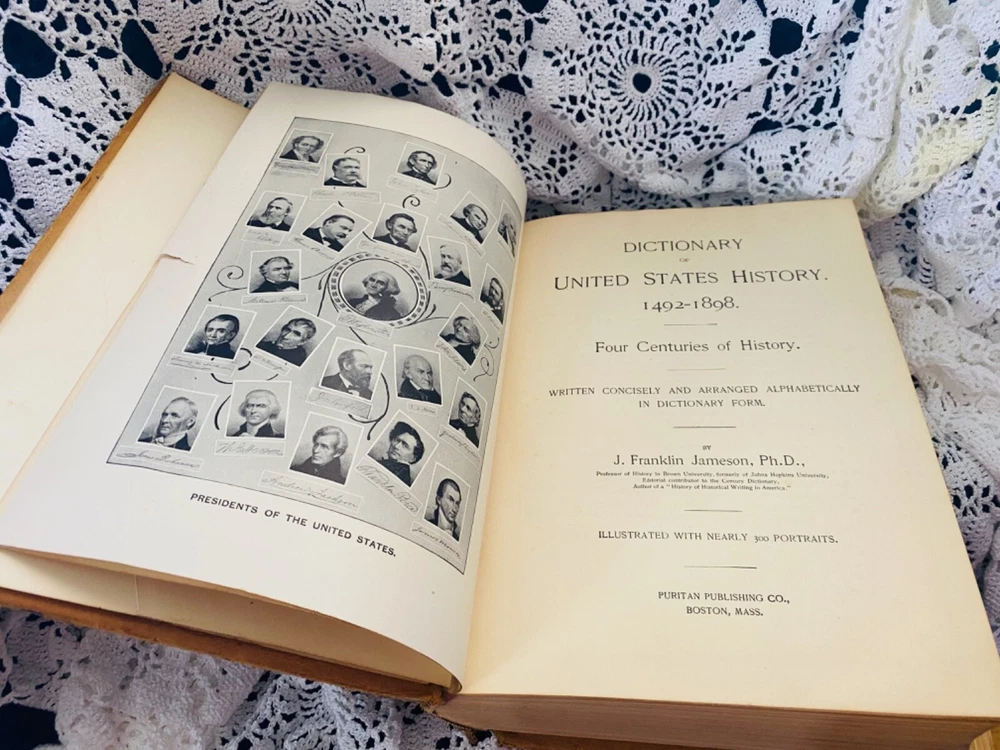 The "Dictionary of United States History 1492-1898" is a collectible book authored by J. Franklin Jameson PhD. This original 1898 edition is a hardcover leather-bound book published by Puritan Publishing Co. in the United States. It is an illustrated reference book covering various historical topics related to the United States, providing valuable insights into the country's history from 1492 to 1898. The book is written in English and is a unique addition to any history enthusiast's collection. Please see all pics they are the description, any questions ,just ask, Thanks.