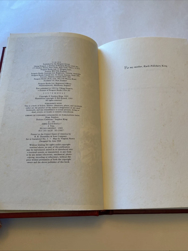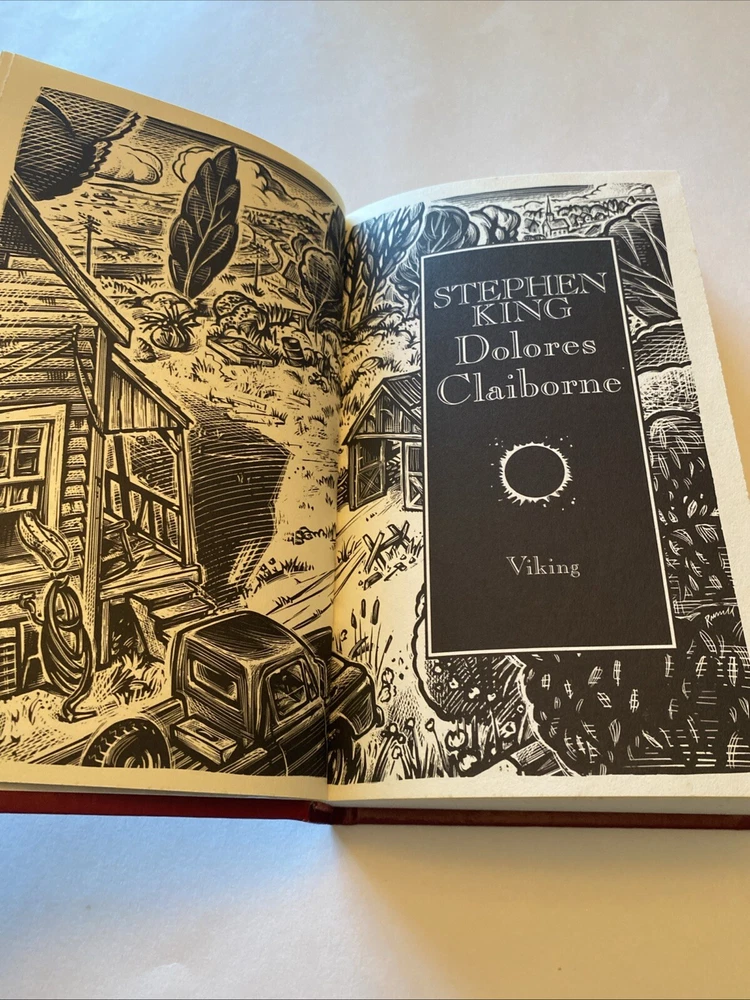 This collector's edition hardcover book, titled "Dolores Claiborne" by Stephen King, is a must-have for any horror or science fiction fan. The book is bound in red leather and features an intricate design on the cover. The narrative type is fiction and the book was published by Penguin in 1993. The original language is English and the era is from the 1980s. The book is in great shape and would make a wonderful addition to any book collection. Condition is Like New. Please see pictures for exact details. Shipping via USPS Media Mail Package.